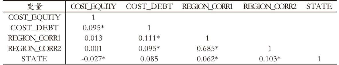 本文首先对模型中的各个变量进行描述性统计,具体结果见表2。可以看出:第一,我国上市公司股权融资成本均值为0.017,负债融资成本均值为0.018,说明本文样本中的上市公司股权融资成本较低,而负债融资成本较高,与国内的部分研究结论一致,意味着相比于国外发达资本市场,我国转型经济中的非成熟资本市场能够为上市公司带来股权融资便利;第二,地区腐败两个度量指标的最大值和最小值具有较大差异,REGION_CORR1最大值为43.462,最小值却只有8.198,说明我国不同地区间的官员腐败程度差异较大,社会发展并不均衡;第三,样本中国有上市公司占比59.5%,说明我国证券市场中国有上市公司较多,同时样本公司平均规模为21.565,平均负债比率为49.4%,平均净资产收益率为5.1%,这些数据的统计结果说明本文的样本取值均在合理范围内,可以排除异常值对本文研究结论的影响。
