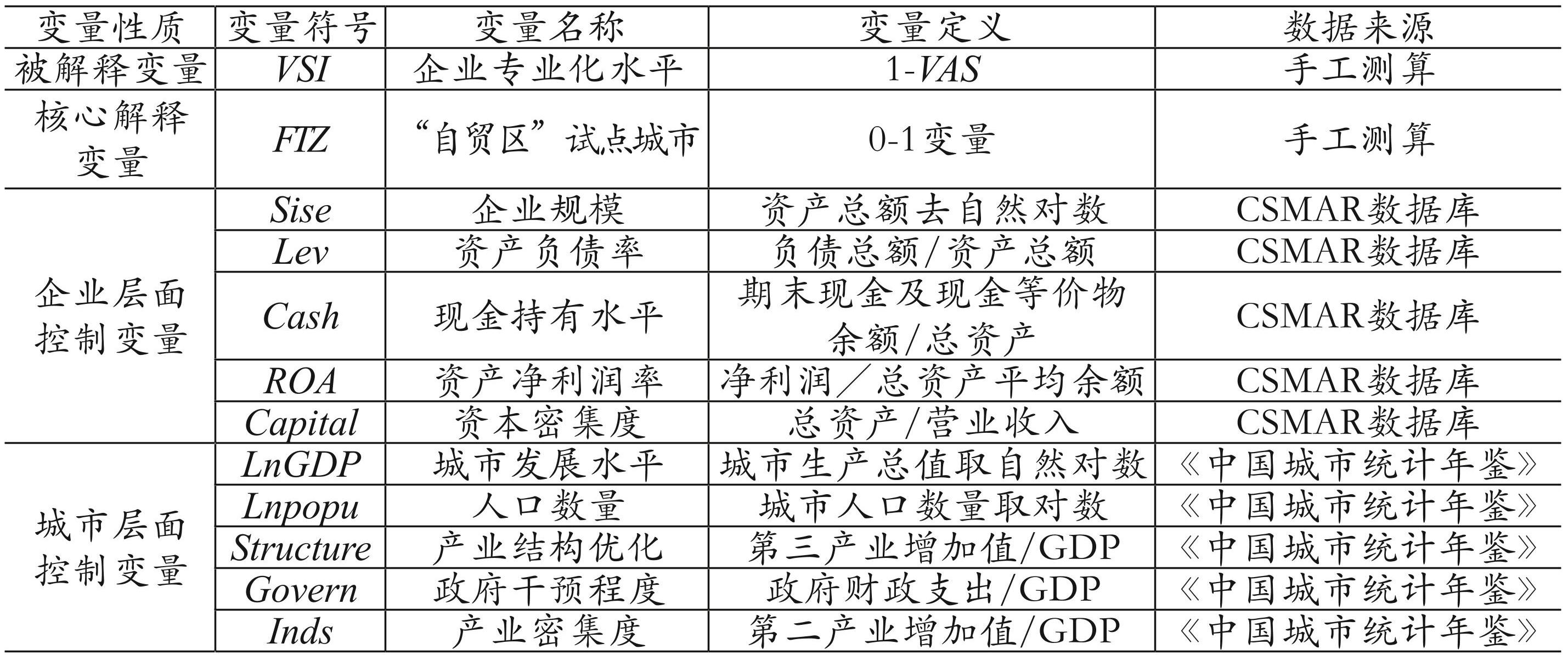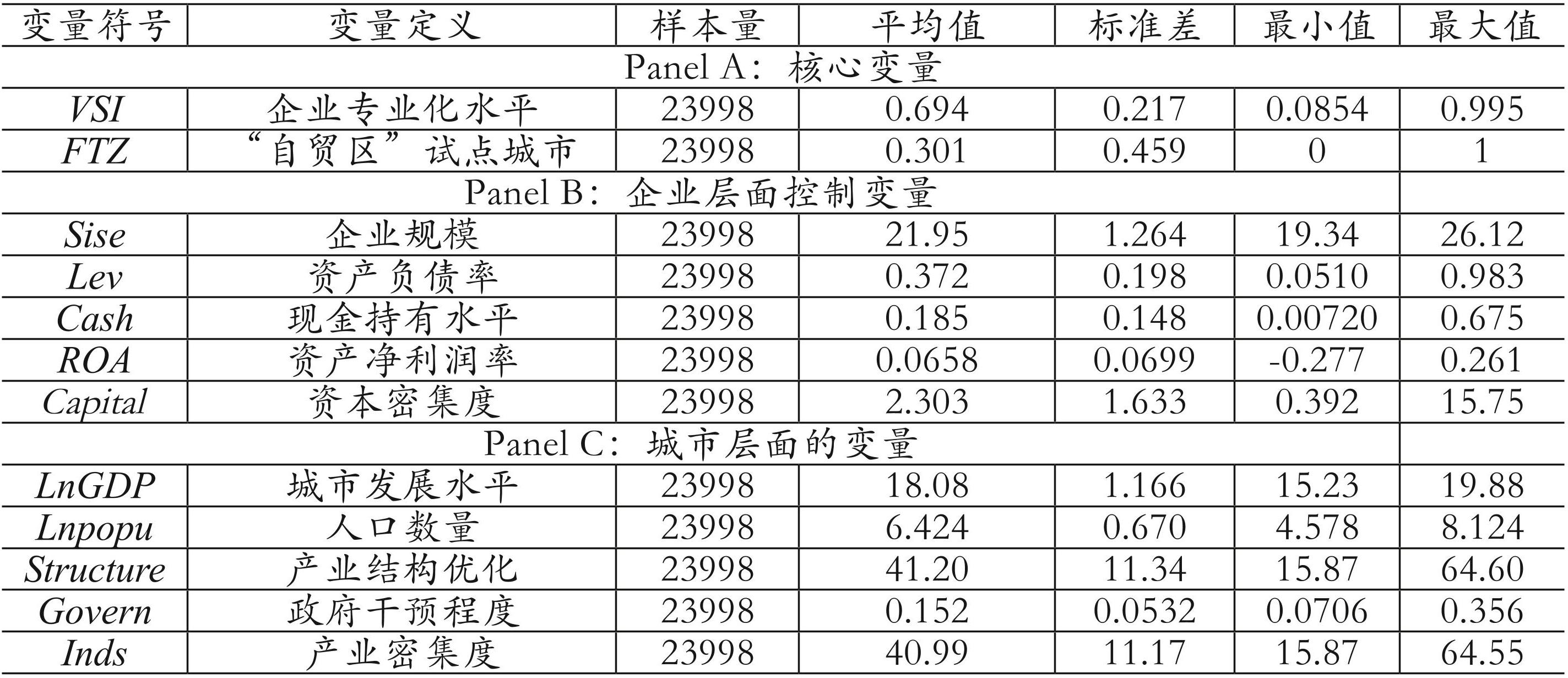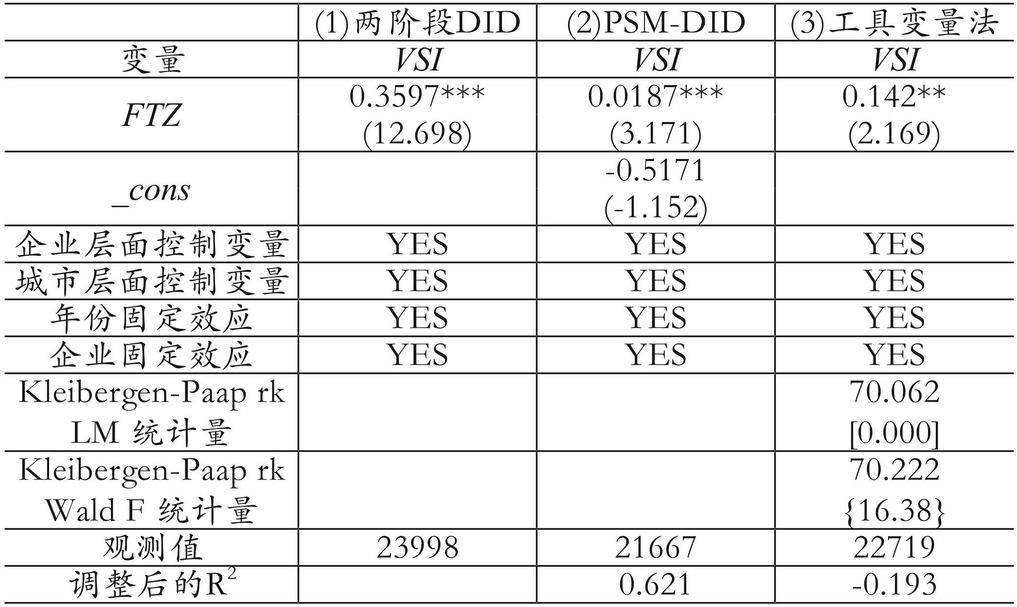 式(1)中,i、c、t分别表示企业、城市和年份,VSIict表示位于c城市的i企业在 t 时期的专业化分工水平,FTZct表示自贸区建设双重差分项,具体含义是c城市在t 时期是否设立了自贸区,是设为1,否则设为0;α2表示自贸区建设对企业专业化水平的影响效应;controlit、controlct分别表示企业层面和城市层面的控制变量;dyear、di 分别表示控制年份固定效应和企业固定效应;εict表示随机扰动项。