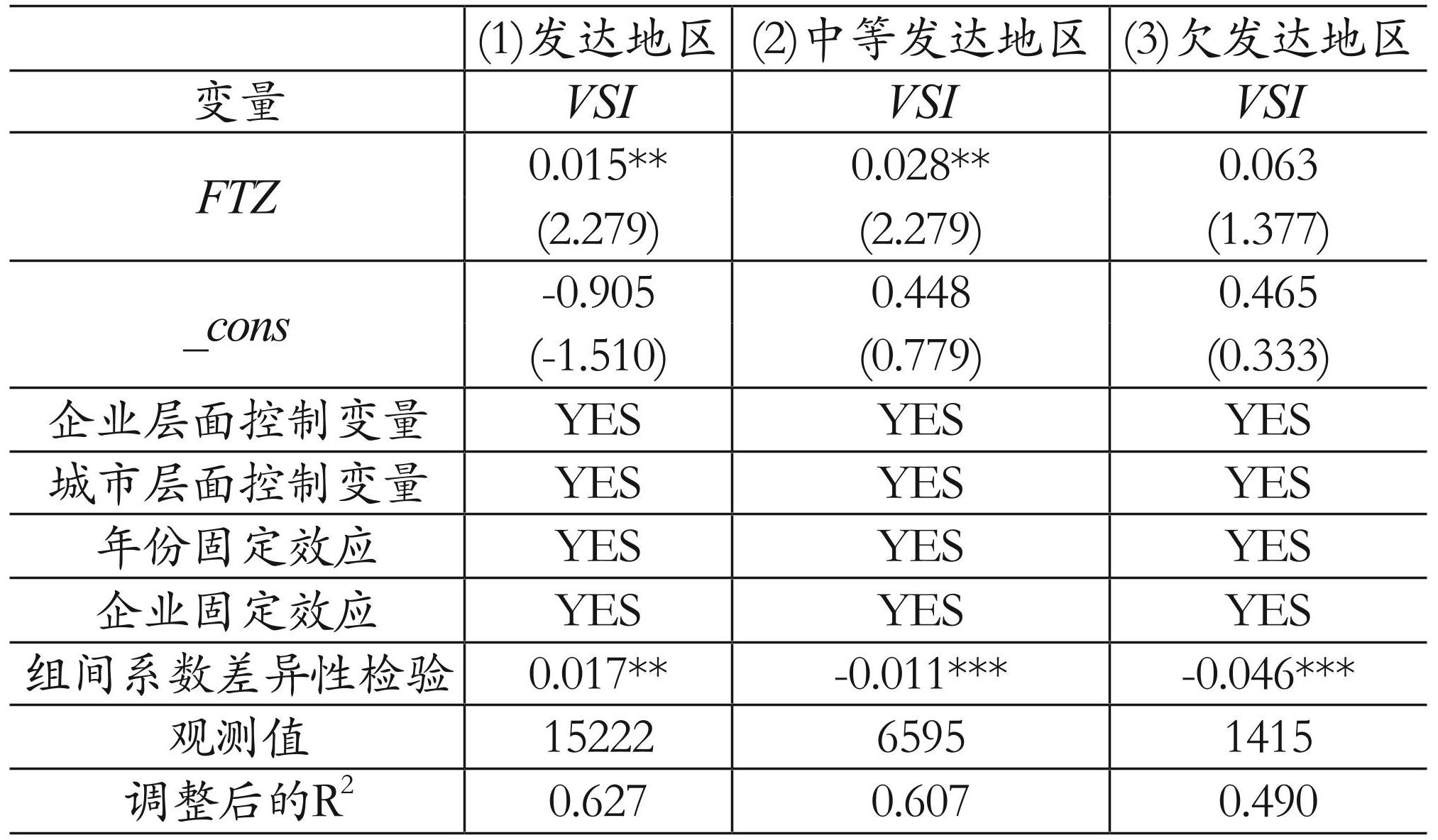 不同地区的经济基础、资源禀赋和产业结构存在显著差异。发达地区拥有完善的基础设施和较强的创新能力,企业更易适应并充分利用自贸区政策,迅速提升专业化分工水平。而中等发达和欠发达地区,由于市场机制不成熟、资源匮乏等原因,企业面临更大挑战,政策效应传导较为滞后。因此,分区域研究自贸区政策的影响,能够更准确衡量其在不同地区推动企业专业化分工的差异化效果,揭示政策对区域经济发展不均衡的深层次影响。本文分别对位于发达地区、中等发达地区和欠发达地区①的企业样本采取分组回归的方式加以探究,结果如表7所示,自贸区建设对发达地区和中等发达地区企业专业化分工的影响显著为正,且对中等发达地区企业专业化分工的影响效应更大,而对欠发达地区企业专业化分工影响则并不显著。可能的原因在于:发达地区和中等发达地区的企业具备较为成熟的产业基础、较强的资源整合能力和市场响应能力,能够更快吸收自贸区的政策红利,利用国际市场开放、降低贸易壁垒等因素实现专业化分工的升级。而中等发达地区的企业可能存在更多的潜在发展空间,因此自贸区建设带来的政策支持和市场开放对其专业化水平的推动效应更大。相较之下,欠发达地区的企业基础薄弱,面临的市场约束、技术瓶颈、人才缺乏等问题更为突出,导致其难以有效利用自贸区政策实现专业化分工的提升。此外,这些地区的市场网络和基础设施相对滞后,也可能制约政策的传导效果,导致其专业化分工效应不显著。