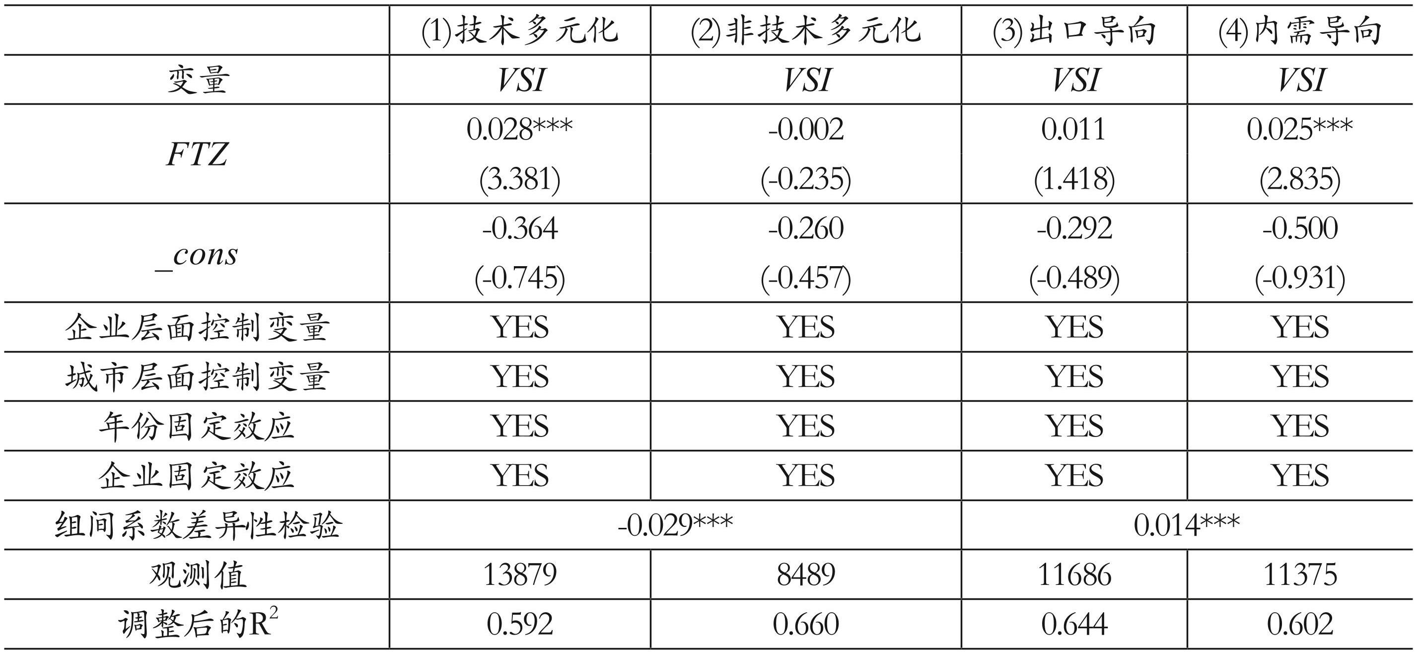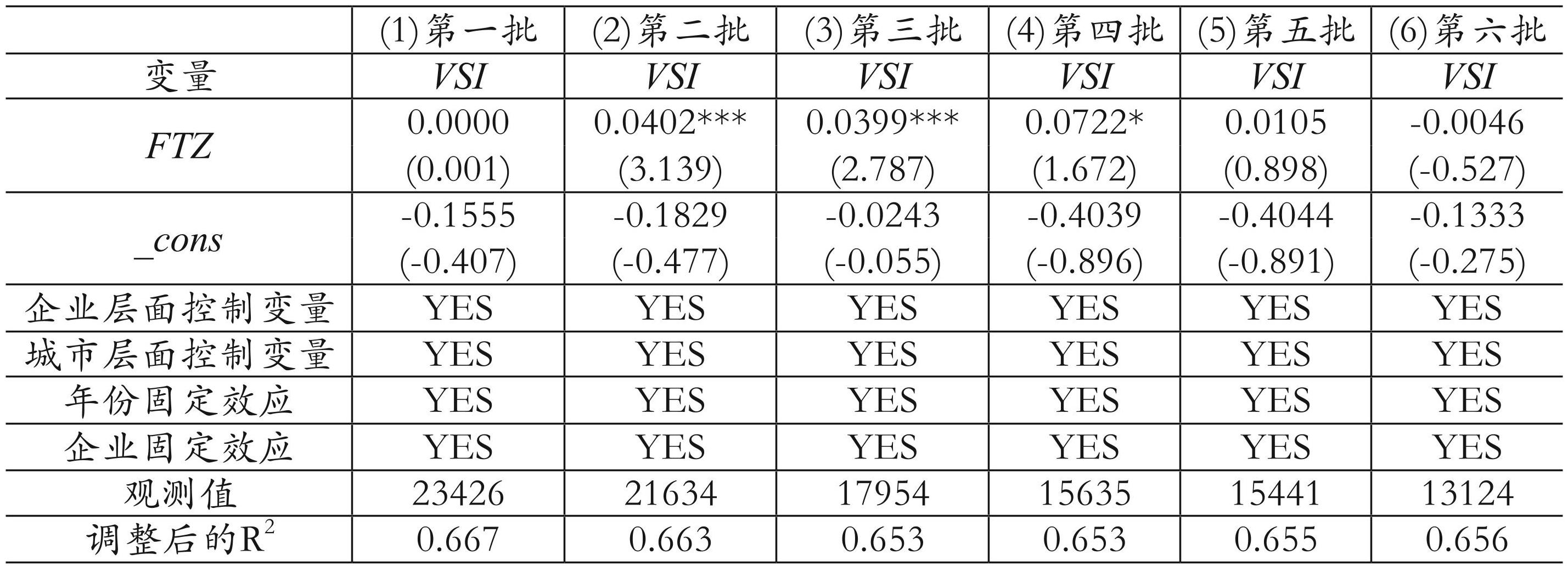 式(4)中,PeerVSIct表示同一城市除i企业自身专业化分工水平外其他同群企业的平均专业化分工水平,其余变量同式(1)。检验结果如表10列(4)所示,自贸区建设与同群企业平均专业化分工水平的交互项显著促进了企业的专业化分工水平。这说明在自贸区促进企业专业化分工水平提升时,同群效应确实存在。