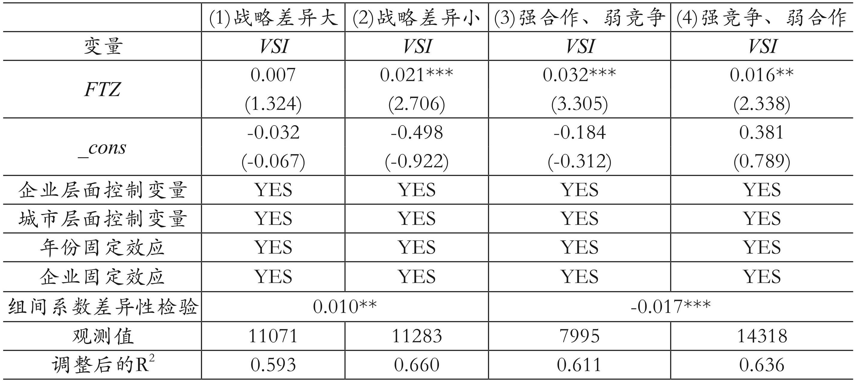 企业战略目标的差异对专业化的需求和表现不同,这些差异可能直接影响企业对自贸区政策的响应和利用程度。因此,企业的战略差异会影响企业的专业化分工进程。基于此,首先借鉴王冰等(2024)的研究从企业管理投入、广告宣传、资本密集度等6个维度测算企业战略与行业平均水平的偏离,根据该数值的中位数,将企业分为战略差异大与战略差异小两组进行回归。其次借鉴谢陈昕等(2022)和陈晓珊 (2024)的研究采用上市公司年报(MD&A)中与竞争和合作相关的词频,计算两者在总词频中的占比,比较两者的大小,若合作词频占比较大,则将企业分为强合作、弱竞争组,反之分为强竞争、弱合作组,进行分组回归,结果如表9所示。结果表明:自贸区建设显著促进了战略差异小的企业专业化分工水平,对企业战略差异大的企业专业化分工的影响则并不显著。此外,自贸区建设无论对强合作、弱竞争组,还是强竞争、弱合作组,都发挥了显著的促进作用,但对更倾向合作的企业影响效应更大,几乎是倾向竞争企业的两倍大。这些结果的原因可能在于企业的战略一致性和竞争动态特征。战略差异较小的企业通常具有更加集中的运营模式,因此能够更好地适应自贸区政策的要求。相反,战略差异较大的企业由于业务较为多元,运营复杂,所以难以充分利用自贸区建设所带来的专业化分工红利。在合作与竞争的维度上,倾向合作的企业可能因自贸区政策中的开放贸易和降低壁垒而受益更多,因为这些企业通常依赖于合作伙伴关系、联合创新等方式加深专业化分工程度。而倾向竞争的企业,可能由于更专注竞争策略,所以未能充分发挥自贸区政策推动专业化的潜力。