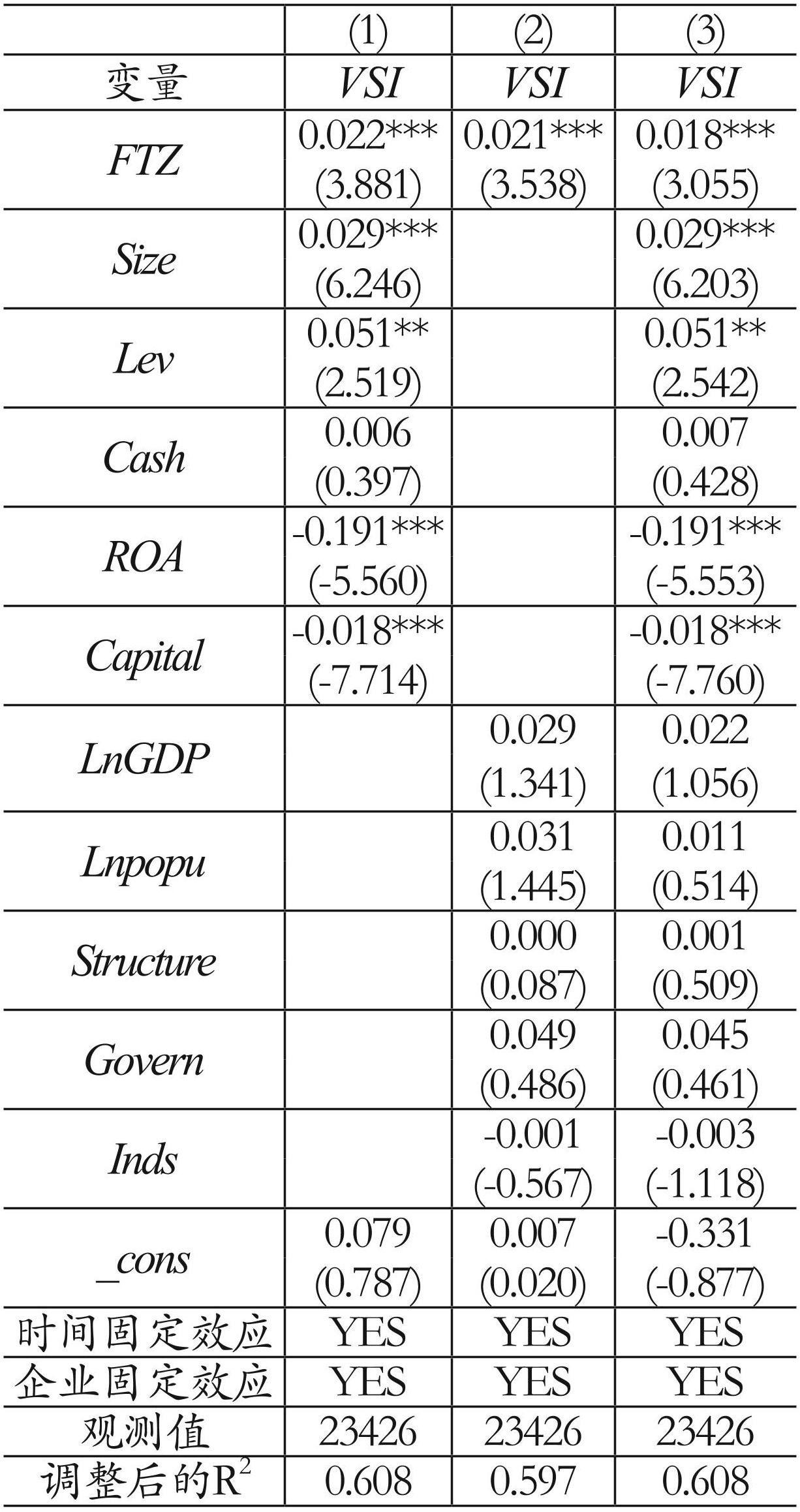 FTZct表示“自贸区”政策的双重差分项,衡量c城市在t时期是否被设立为自贸区,是设为1,否则设为0。