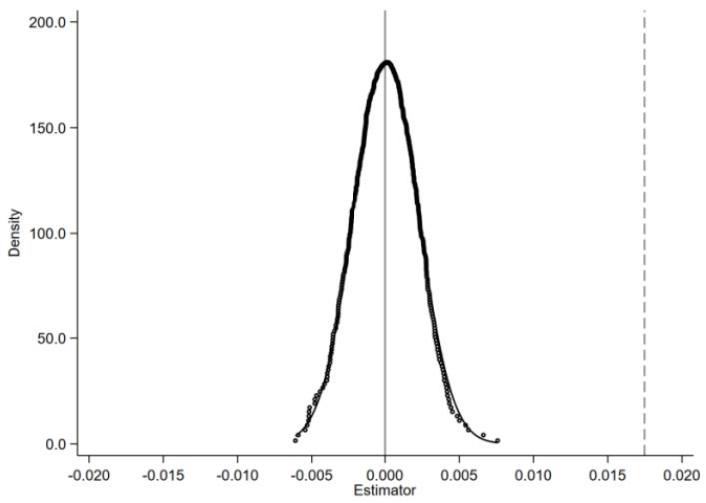 为排除可能存在的不可观测因素对回归结果产生影响,造成认知偏误,本文随机生成时间虚拟变量和政策虚拟变量的交互项,并进行500次的随机测试,将所得核心解释变量的估计系数绘制成核密度图。结果如图2所示,自贸区试点政策的所有回归系数集中在零点左右呈现正态分布,说明该测试满足随机性要求。基准回归的真实估计系数显著异于随机测试结果,进一步说明自贸区建设对企业专业化分工的促进效应并非偶然所得。