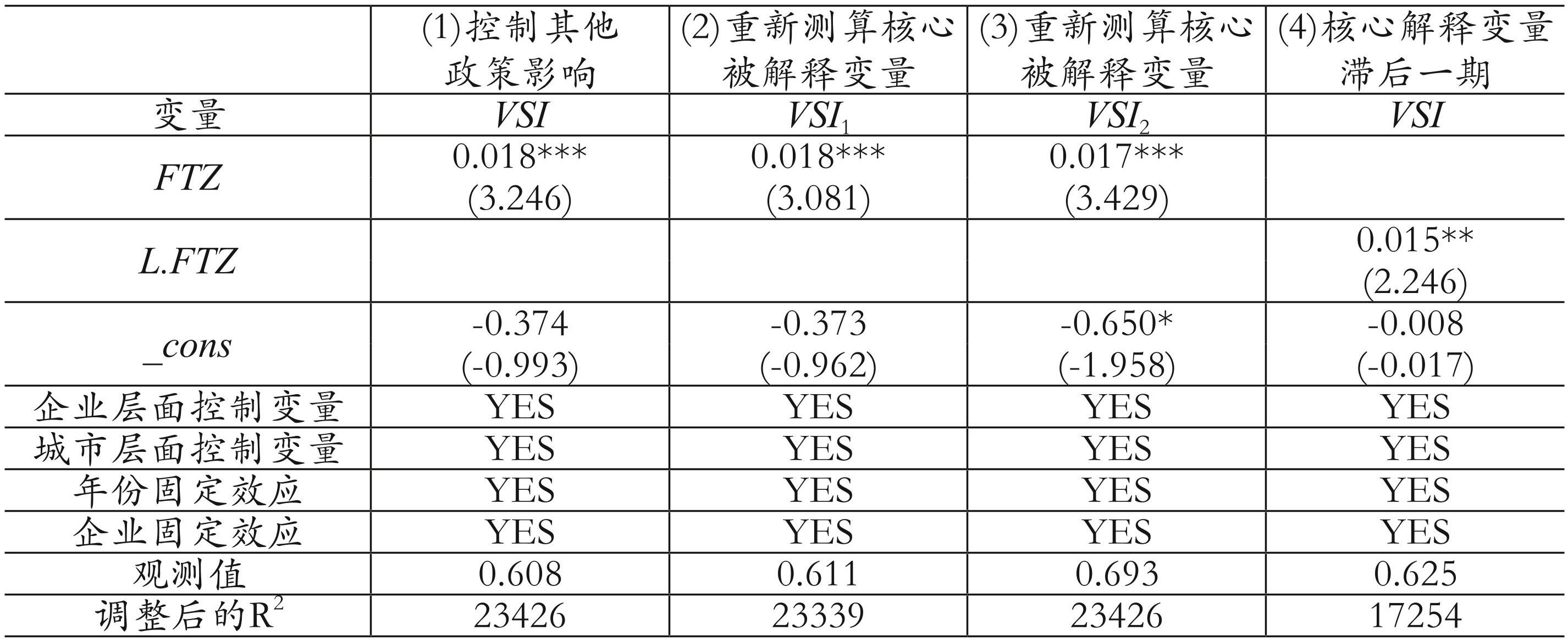 除以上方法外,本文参考相关文献还采取了以下稳健性检验:①考虑到其他政策造成的可能干扰,控制了“跨境电商”政策、“服务贸易创新发展试点”政策和 “国家级大数据综合试验区”政策影响后进行重新回归,结果如表6第(1)列所示; ②重新测算企业专业化分工水平,首先将前文的增值税税率由17%修改为13%,求得企业的专业化分工水平VSI1,其次借鉴袁淳等(2021)重新测算企业专业化分工水平 VSI2,更换核心被解释变量回归后结果如表6第(2)、(3)列所示。③考虑到自贸区政策的滞后性影响,将核心解释变量做滞后一期处理进行回归,结果如表6第(4)列所示。经过以上稳健性检验,本文核心结论依旧成立。