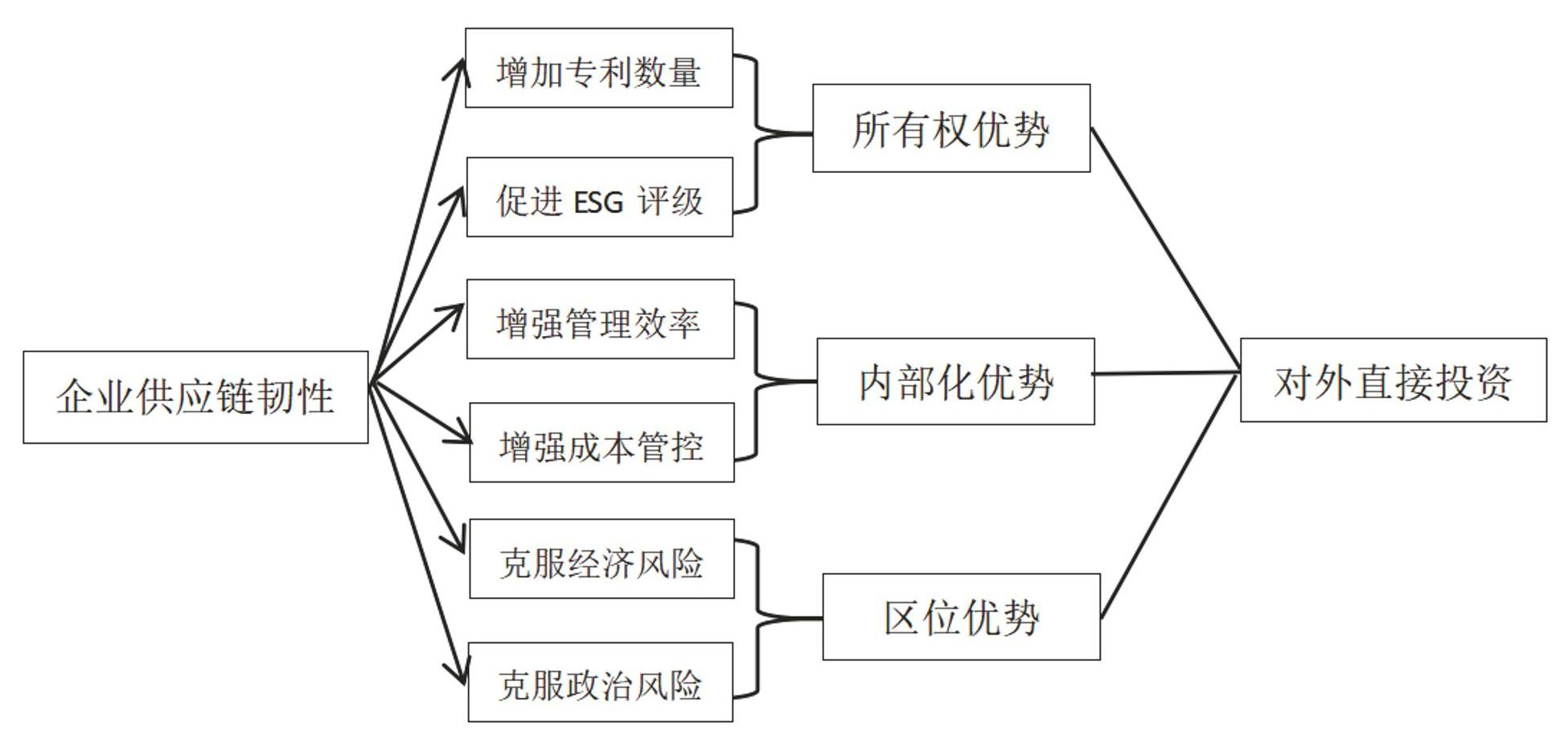 韧性最初应用于物理学领域,是指物体受外力作用时,能吸收能量并发生变形而不断裂的性质。近年来,韧性概念大量运用于经济学领域,其中供应链韧性主要指供应链体系在遭受市场冲击风险和环境不确定性后能够恢复到正常状态甚至达到更加理想状态的能力(Ponomarov & Holomb,2009)。供应链韧性能助力企业应对外部环境风险和不确定性,有助于企业在技术创新、生产效率和物流设施等方面投入更多资源(Sheffi,2007;张勇和侯路遥,2024;Tukamuhabwa et al.,2015),进而推动企业国际化发展。对跨国公司而言,对外直接投资受多方面因素影响。根据国际生产折衷理论(Dunning,1980),企业开展对外直接投资应具备所有权优势、内部化优势与区位优势三种因素。供应链韧性为企业获取这三种优势提供了保障,因此本文以这一理论为基础,研究供应链韧性如何通过三种优势推动企业对外直接投资,以期在理论上进一步阐明我国对外投资规模快速增长的重要动力来源,在实践上为内外双循环的贯通提供依据。
