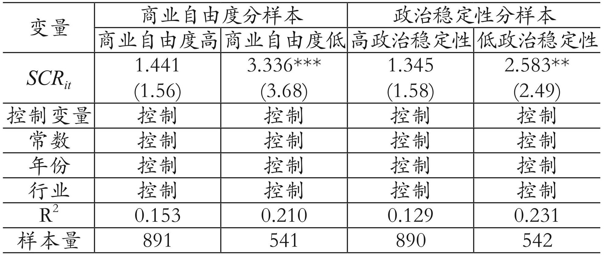 由于国际生产折衷理论涉及的区位优势侧重企业的战略选择,难以采用单一数据来测度,因此本文以供应链韧性克服外来者劣势的角度,研究供应链韧性的中介效应。基于美国传统基金会商业自由度指标及WGI政治稳定性指标,本文分别以两者均值为分界进行分样本回归,结果如表9所示。前两列表明,供应链韧性在商业自由度较低的样本中对企业对外直接投资具有更显著的正向影响。低商业自由度通常意味着市场透明度不足及运营障碍增多,但具备供应链韧性的企业通过信息共享及供应链支持,能有效缓解投资风险并促进投资。相较之下,高商业自由度地区因市场机制完善,自身对投资的吸引力较强,供应链韧性的促进效应不明显。后两列结果表明,供应链韧性在政治稳定性较低的样本中对企业对外直接投资的作用更为突出,反映其在不确定环境下的适应性与抗风险能力。而政治环境稳定且制度完善的地区,因其良好的制度质量,本身就能够提升企业的投资效率(李世杰等, 2021),因此供应链韧性对强政治稳定性地区的对外直接投资促进效应不显著。综上,假说H4得到有效验证。