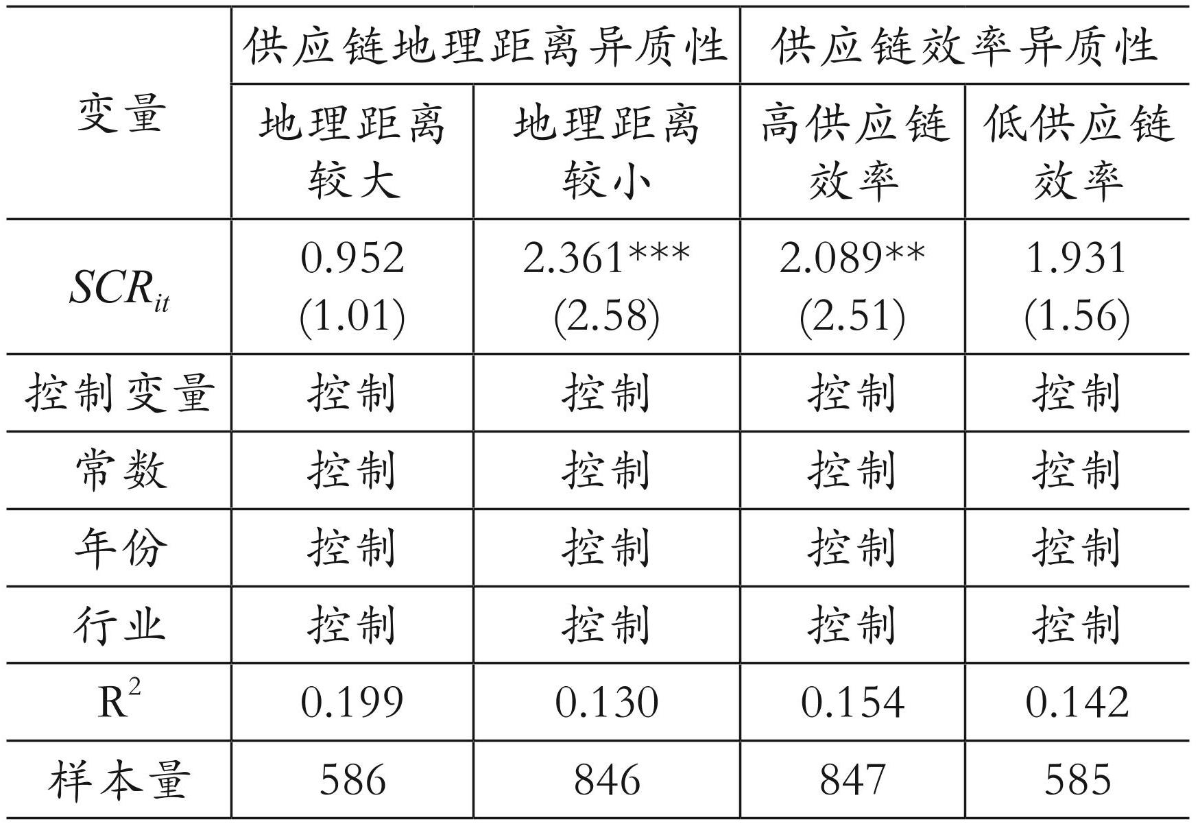 本文进一步从供应链地理距离和供应链效率两个维度进行分组分析,以检验不同供应链特征下韧性作用的差异。当供应链地理距离较近时,供应链之间高效的信息流动使得企业在遇到外部风险时能够更快速地做出反应,从而提升其韧性水平,促进企业的对外投资活动。本文根据供应商和客户注册地址的经纬度信息测量双方的地理距离,并以平均值为分界线,划分为供应链地理距离较大和较小样本。表11前两列显示,供应链韧性对企业对外直接投资的提升作用在供应链地理较小的样本中更为显著。