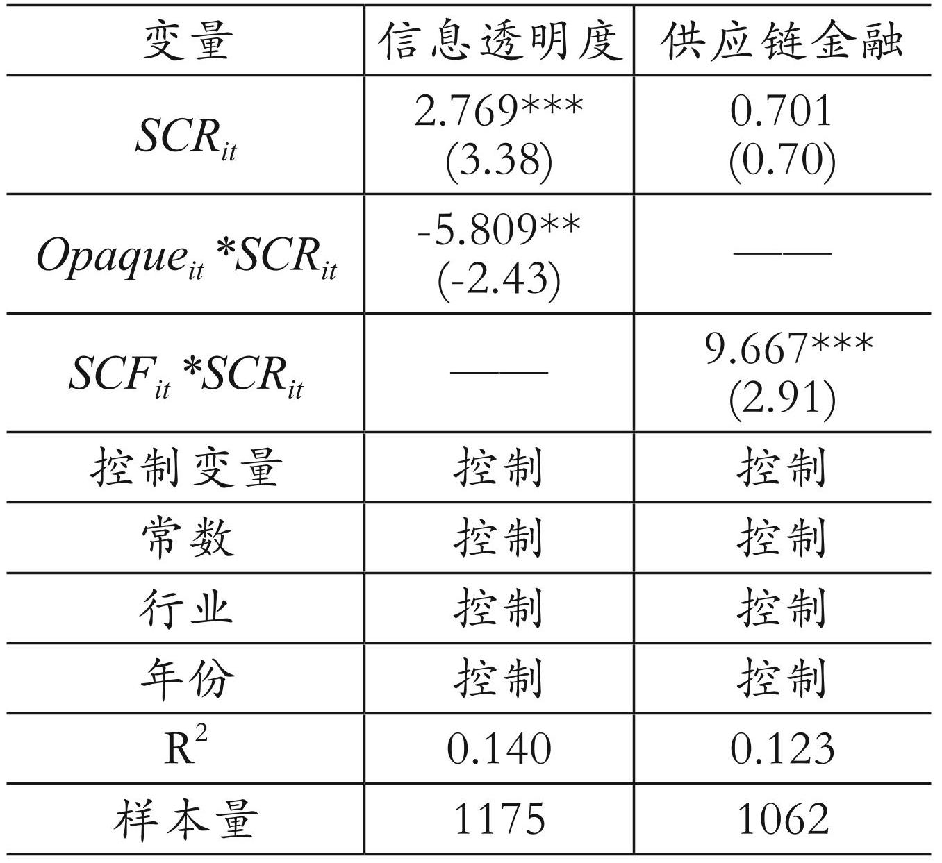 中国上市公司企业信息透明度和供应链金融发展程度差异可能会导致供应链韧性对企业对外直接投资规模的影响产生调节差异。Opaqueit代表企业信息透明度,本文参考王亚平等(2009)的做法,使用上市公司过去3年操控性应计项目绝对值之和衡量企业信息透明度,该指标值越大,企业信息透明度越低。SCFit代表供应链金融水平,本文参考王立清和胡滢(2018)的方法,采用短期借款和应付票据之和除以企业总资产衡量,越大的指标值代表越高的供应链金融水平。