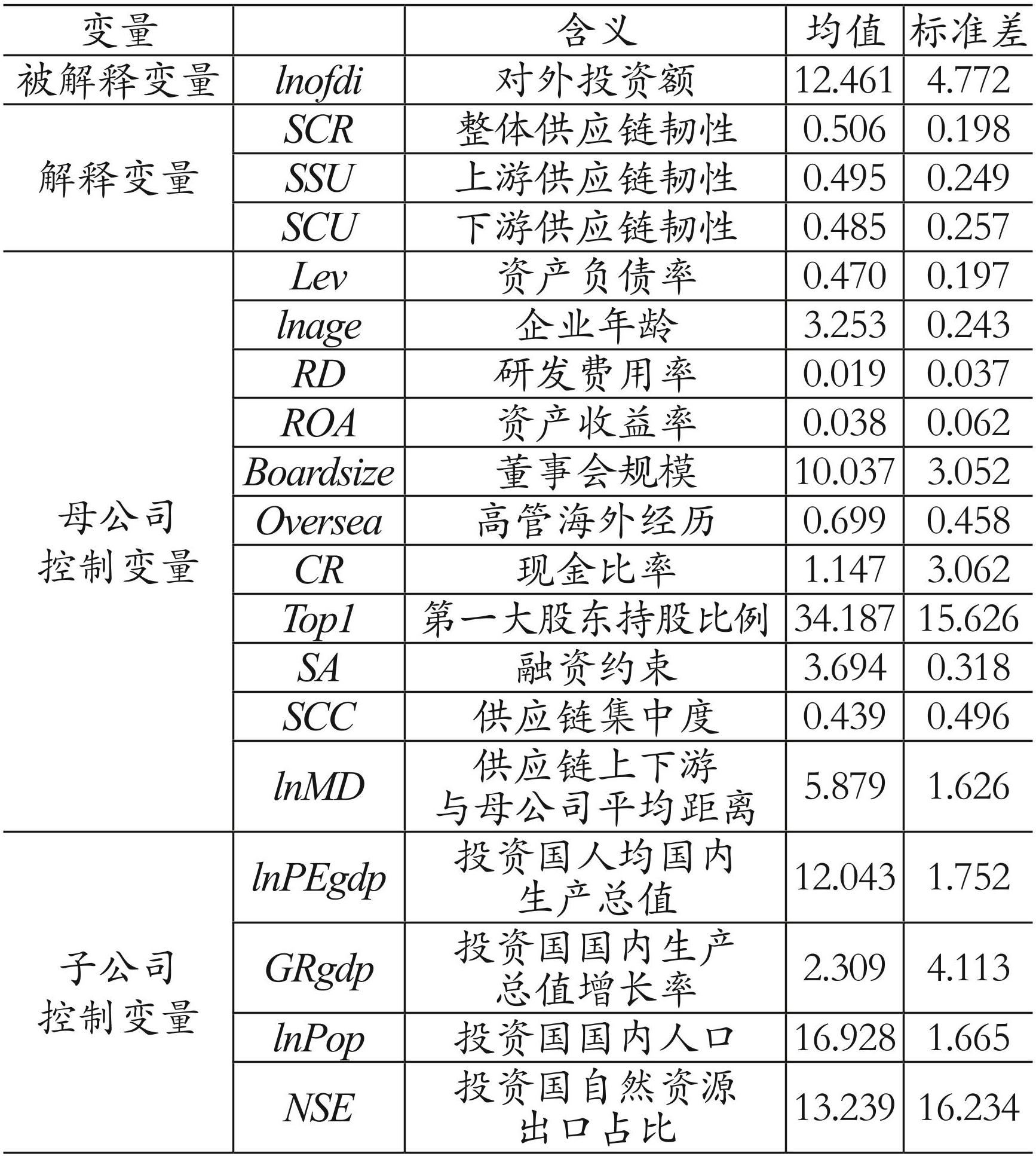 式(1)中Xit为本文回归方程的控制变量集合,分为母公司和子公司两个层面的控制变量。母公司层面包括:企业资产负债率Levit、企业年龄lnageit、企业研发费用率RDit、企业净资产收益率ROAit、董事会人数Boardsizeit、企业海外背景高管占比 Overseait、企业现金流比率CRit、第一大股东持股比例Topit、企业融资约束SAit、企业供应链集中度SCCit以及上下游供应链与母公司之间空间距离的平均值lnMDit(对数值)。子公司层面包括:投资所在地人均国民生产总值(对数值)lnPEgdpit、投资所在地国民生产总值增长率GRgdpit、投资所在地国内人口数量(对数值)lnPopit以及投资所在地自然资源出口占比NSEit。