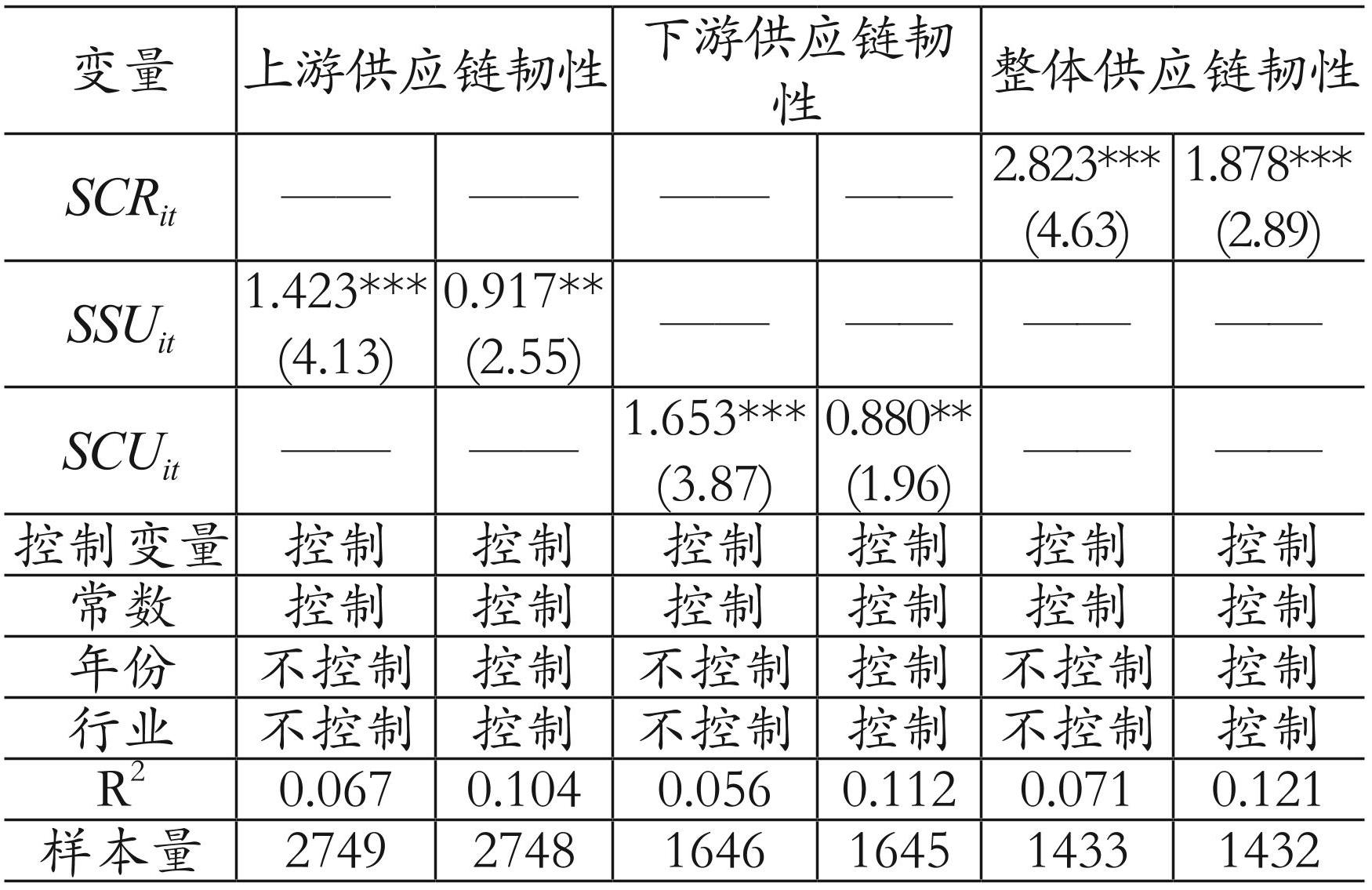 因本文样本中较多上市公司未披露或未连续披露供应链信息,故难以构建连续年份的供应链韧性指标,甚至部分样本仅有一年指标数据,也使本文无法使用面板数据进行回归。此外,本文利用CNRDS数据库中的海外子公司注册资本构造企业对外投资规模指标,但该数据库中较多上市公司年份数据并不均衡,若直接与供应链韧性指标一起构建模型,会导致样本量变少。故本文将不同上市公司旗下海外子公司以不同年份样本数据混合后对式(1)进行回归,结果见表2。