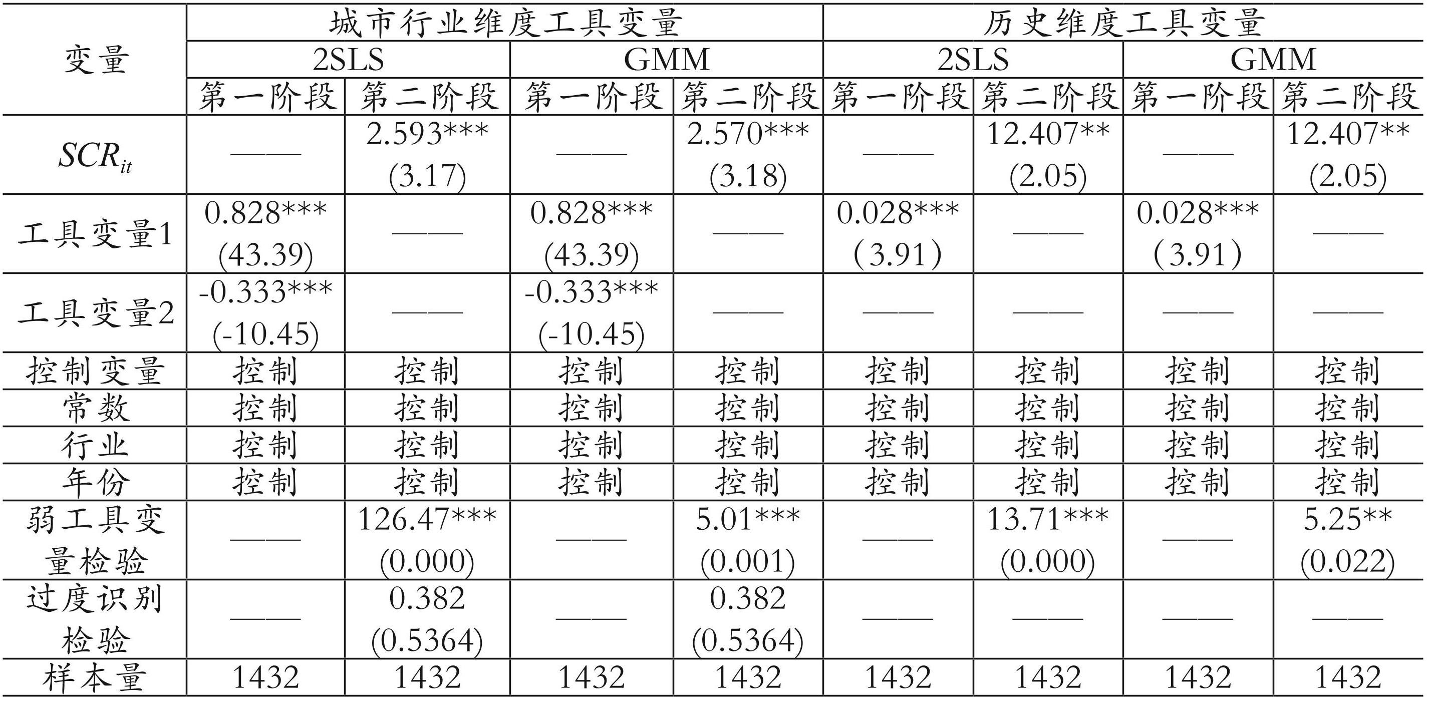 注:弱工具变量和过度识别检验括号内为P值;其他括号内为回归T值。
