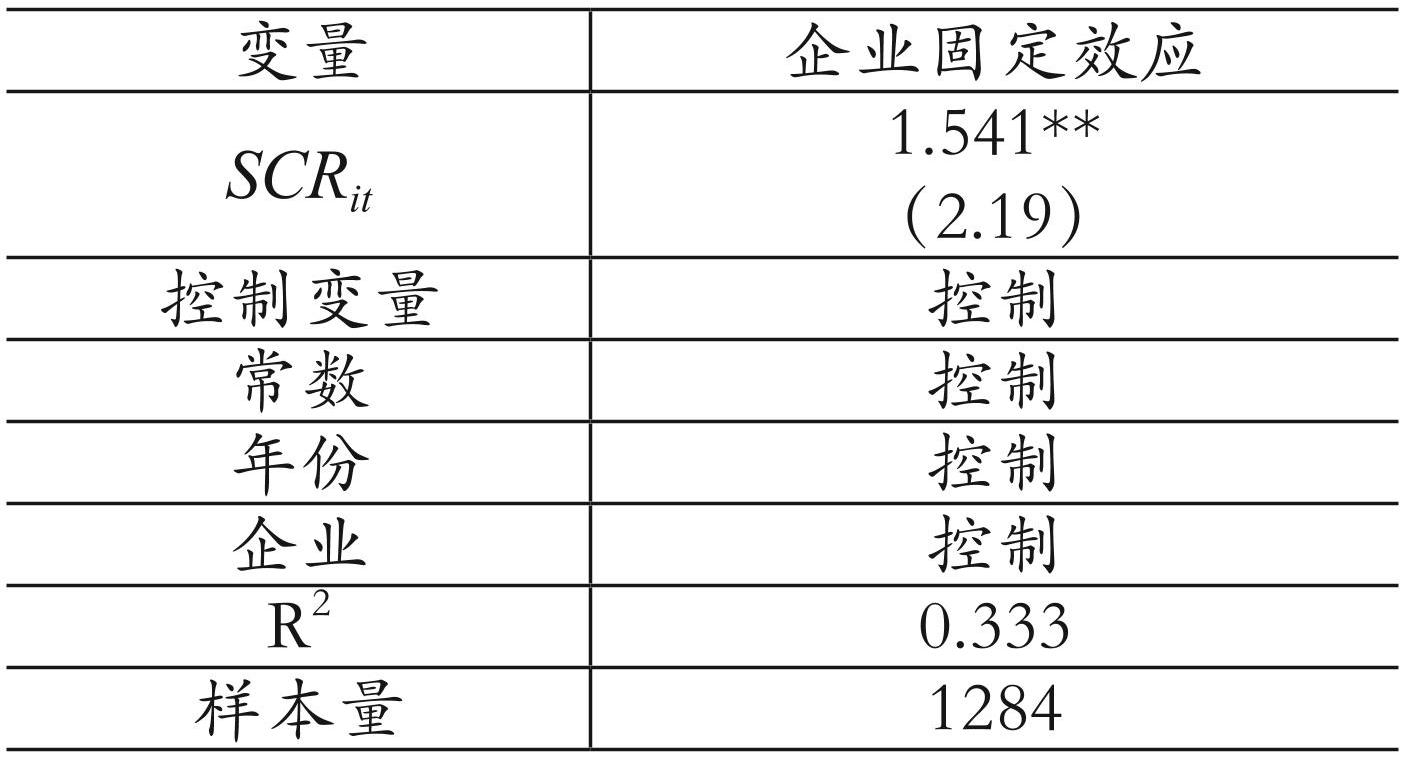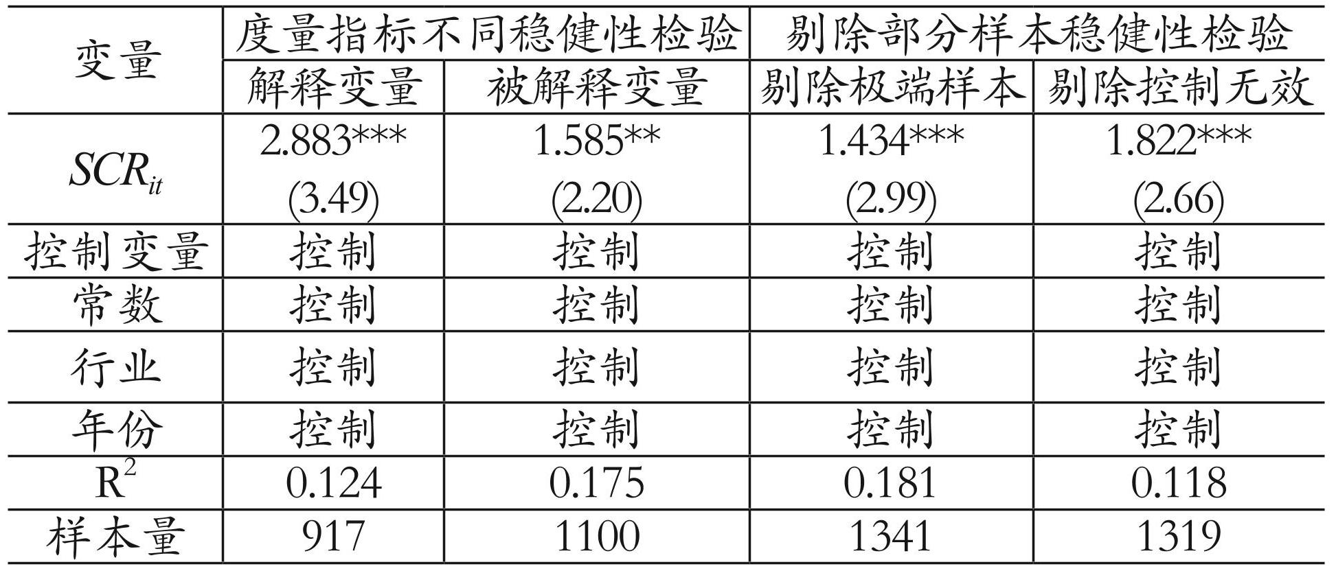 为进一步确保回归结果的稳健性,本文采用多种不同方式对式(1)进行回归,结果见表4。表4第1 列采用更为严格的直接持股比例来测算企业对外直接投资额;第2列采用更为严格的连续3年稳定位列前五的上下游供应商和客户占比构建供应链韧性指标。SCRit 的系数在两列中仍显著为正,说明解释变量和被解释变量采用不同度量方式后并不改变基准回归结果。第3列为剔除投资额为极端值的样本,第4列为剔除内部控制无效样本。SCRit的系数仍显著为正,有效验证了本文的结论是稳健的。