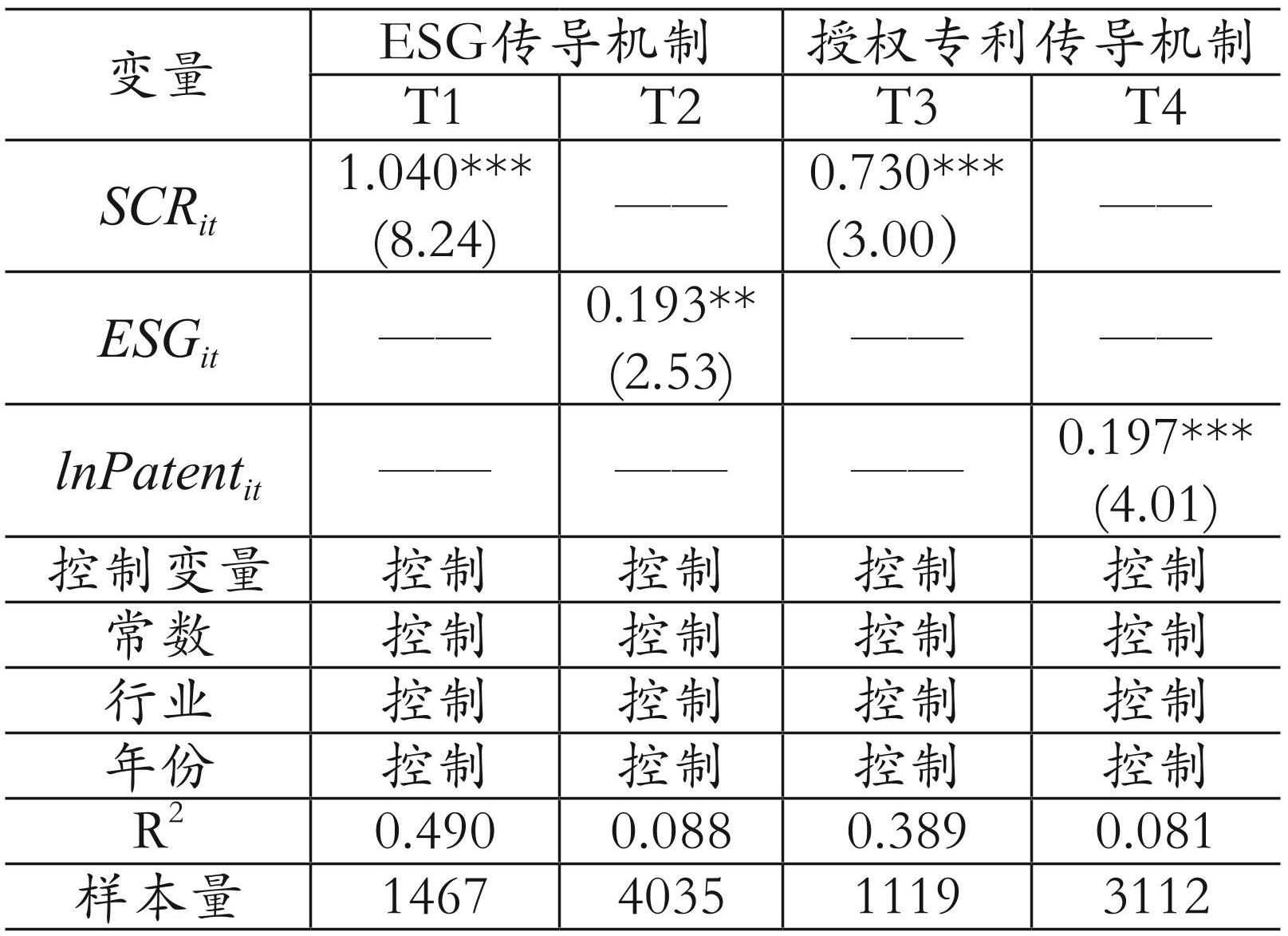 所有权优势通常体现在企业的品牌影响力、市场声誉和创新能力等方面,这些因素共同构成了企业在国内外市场中保持竞争力的关键。企业的ESG实践是构建无形资产,提升企业商誉声誉价值的重要助推力;与此同时,技术专利则体现了企业的创新能力。因此,本文使用华证ESG评级得分年均值ESGit和企业授权专利数量(对数值) lnPatentit共同衡量企业所有权优势,并通过四个方程检验企业所有权优势渠道传导机制。