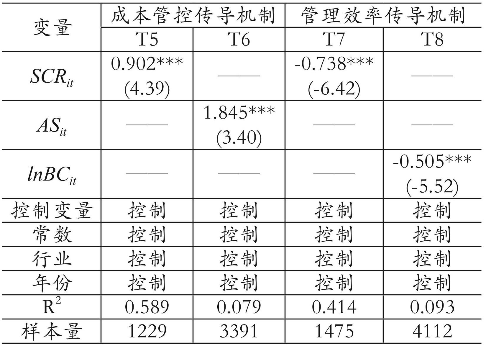 表8为成本管控机制和管理效率机制的回归结果,T5和T7列的被解释变量分别为企业资产专用度ASit和企业营业周期lnBCit,解释变量为供应链韧性SCRit,T5列回归结果显示供应链韧性对企业成本管控能力的促进作用;T7列回归结果显示SCRit的系数显著为负,说明供应链韧性能提升企业管理效率。T6和T8列的被解释变量均为企业对外直接投资额lnofdiit,解释变量分别为企业资产专用度ASit和企业营业周期lnBCit,结果显示企业成本管控能力和管理效率提升有助于推动企业对外直接投资。因此,供应链韧性通过提升企业内部化动力促进对外直接投资,有效验证了本文的传导机制假说 H3。