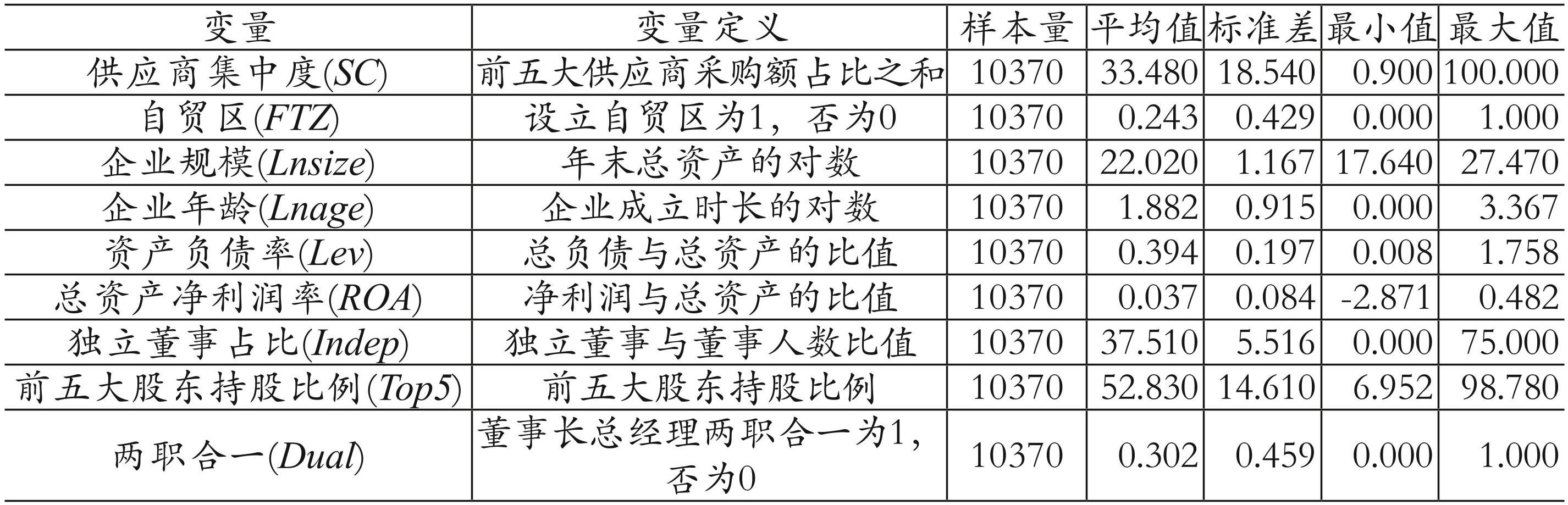 被解释变量:本文的被解释变量是供应商集中度。借鉴已有研究(高震男等, 2023),本文以前五大供应商采购额占比之和衡量上游供应商集中度,其变量取值范围在0到1之间,取值越大表明供应商集中度越高。