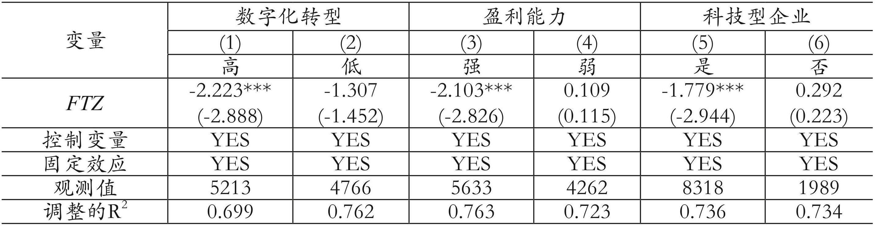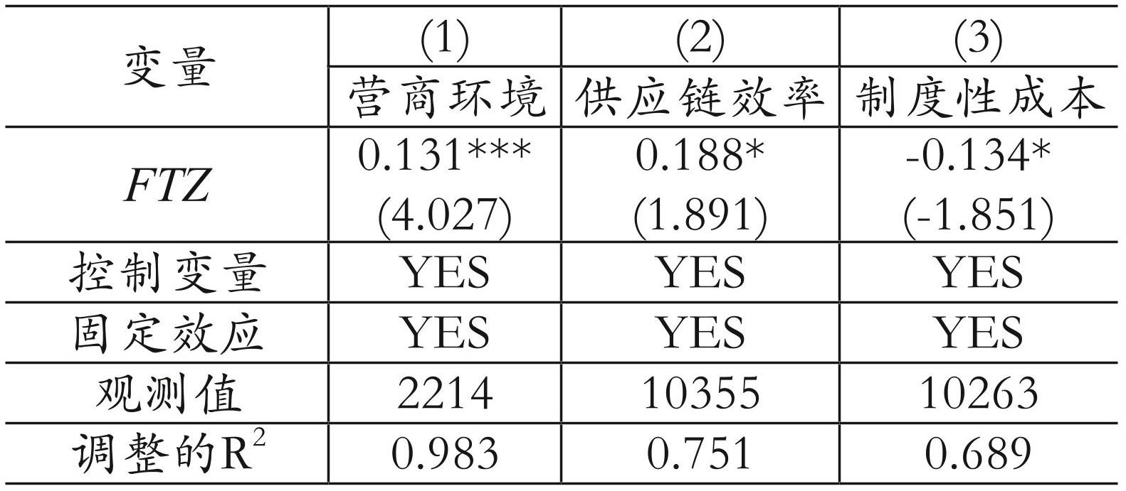 企业在进入市场或者为自己拓展良好的关系环境时,往往需要付出一定的制度性成本。招待费作为企业与外部建设关系网的主要支出,一定程度上能体现企业为了提高其市场灵活性,降低制度性障碍所做的努力,因此本文以招待费作为企业制度性成本的代理变量。表7第(3)列结果显示,自贸区系数显著为负,说明自贸区通过改善政务环境来降低企业的制度性成本,验证了假说4。