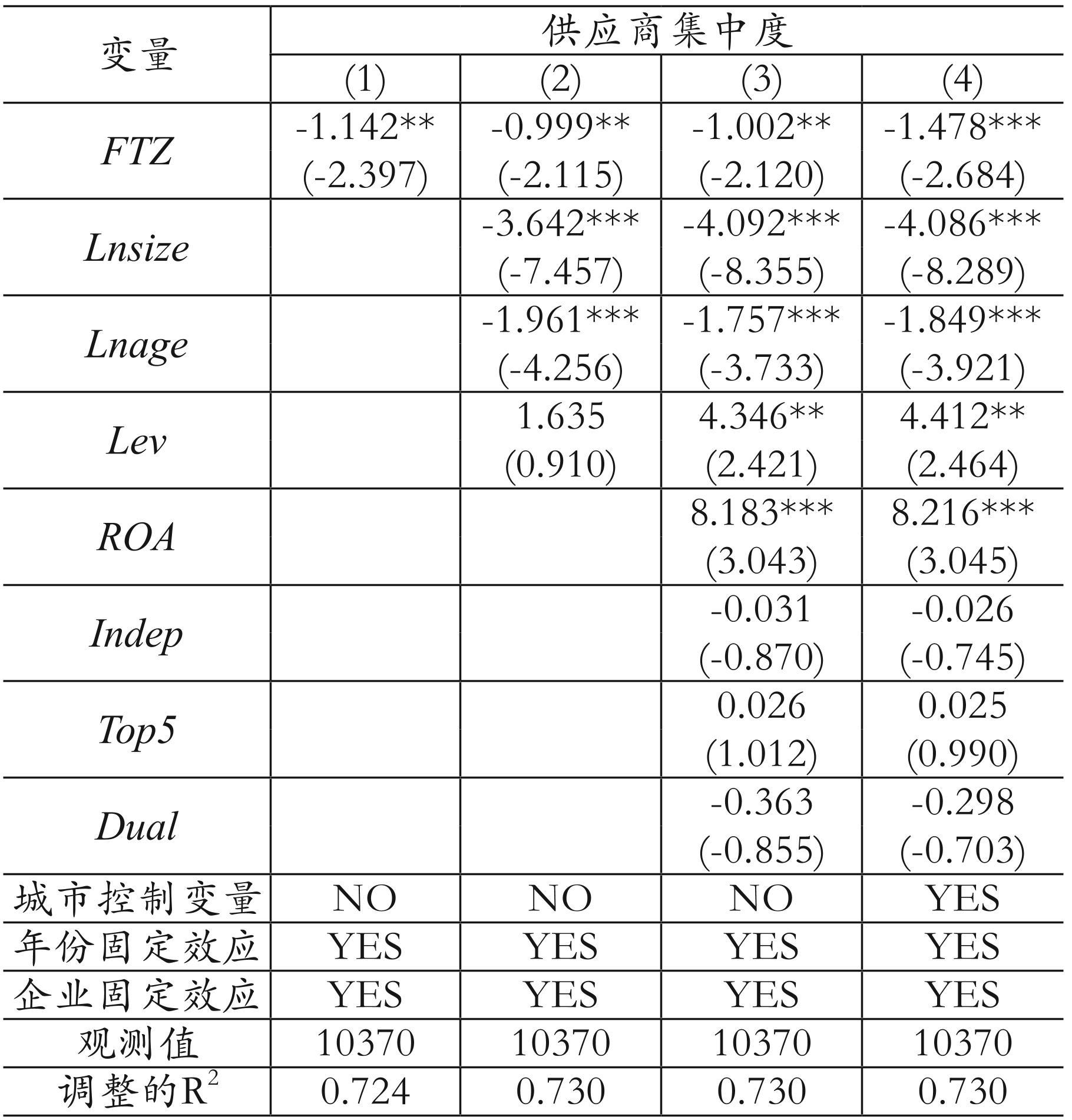 其中,下标i代表城市,t代表时间;Yit表示企业i在第t年的供应商集中度,FTZit 为考察是否设立自贸区的虚拟变量,若城市i在第t年有设置自贸区,则赋值1,否则为0。Controls表示一系列可能会影响企业供应商集中度的控制变量。δi为企业固定效应,μi 为时间固定效应,εit为残差项。