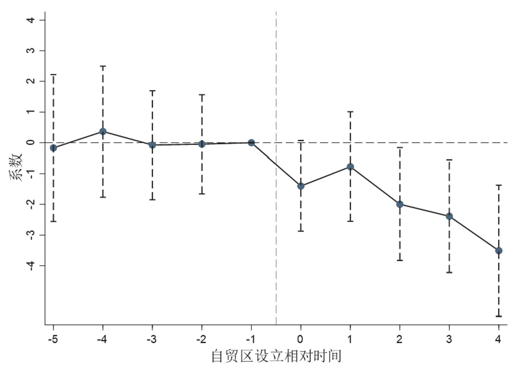 其中,t0代表自贸区设立的时间点, 代表自贸区i设立前后第k年的虚拟变量,当处理组城市i在t0年之后则赋值1,否则为0。t0+k根据自贸区批次的不同表示不同的相对年份。βk表示处理组城市对供应商集中度变化的动态反应。图1展示了自贸区影响供应商集中度的动态趋势,横轴代表自贸区设立的相对年份,纵轴代表每一个βk估计系数的大小,可以看到在自贸区设立的前五年βk均分布在零值附近且都不显著,表明处理组和控制组的供应商集中度在自贸区设立之前并没有系统性差异,满足事前趋势; 而在自贸区设立年份之后供应商集中度开始呈现明显下降,虽然在设立当期和第一年的系数不显著,但在第二年之后都显著降低且具有持续性趋势。可见,自贸区设立发挥的供应商配置效益具有一定的时滞性,并随着时间增加,作用效果日益显著。