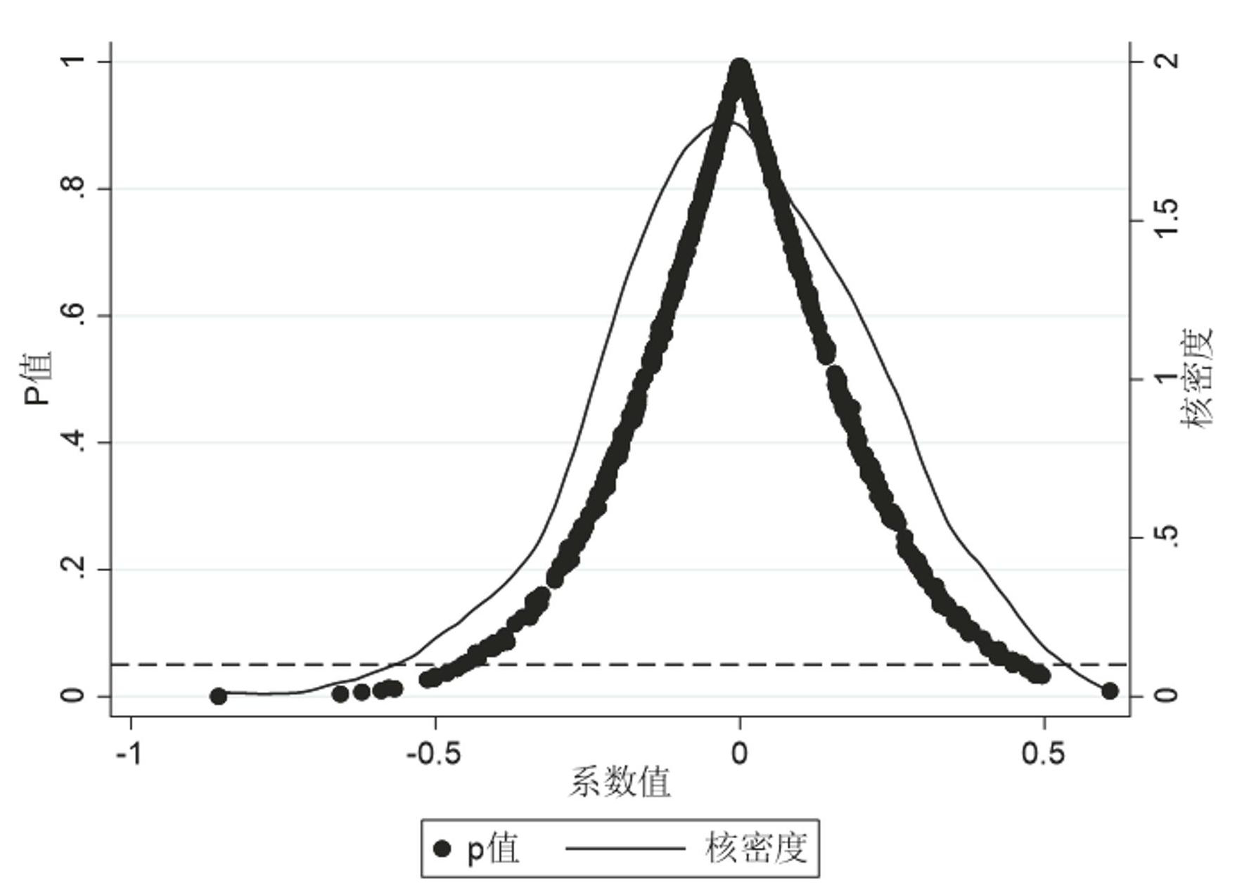 输出结果如图2所示,供应商集中度对“伪政策实施虚拟变量”回归系数的均值接近于0且距离基准回归系数较远,同时估计系数的分布接近正态分布,大部分系数的P值都大于10%且不显著,表明自贸区对供应商集中度的影响并非其他随机因素导致,说明本文结论具有可靠性。