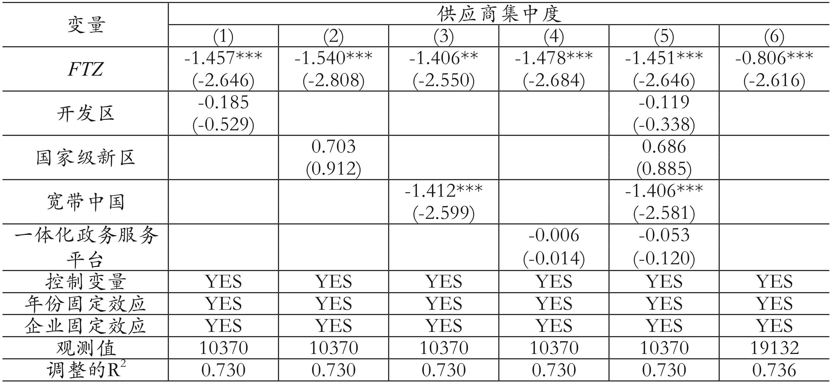 本文试图论证以自贸区为表征的制度型开放能够通过改善宏观外部环境推动企业优化上游供应商配置,但同样作为国家层面的试点政策也可能会通过输送政策或改善制度来引起对供应商配置重构,从而影响本文的研究结论。对此,本文借鉴张柳钦等 (2023),考虑了样本期内可能对供应商集中度产生影响的国家级政策,包括“开发区”“国家级新区”“宽带中国”和“一体化政务服务平台”。因此,本文收集以上四个国家级试点城市有关信息,构造了同自贸区一样的政策变量,当城市i在t年之后推行试点,则赋值为1,否则为0,并纳入模型(1)进行回归,以排除上述政策时间对本研究的干扰。具体回归结果如表3所示,第(1)~(4)列为分别加入四个政策虚拟变量,第 (5)列为各个政策虚拟变量全部作为控制变量一同加入模型。在控制了这些可能影响供应商集中度的政策变量后,自贸区系数仍至少在5%的水平上显著为负,与基准回归并无较大差异,说明自贸区通过制度型开放降低上游供应商集中度并未受到其他同期政策的干扰。此外,本文进一步将数据扩展到2022年,表3第(6)列的结果显示,自贸区系数仍在1%的水平上显著为负,说明自贸区对供应商多元化的影响持续存在。