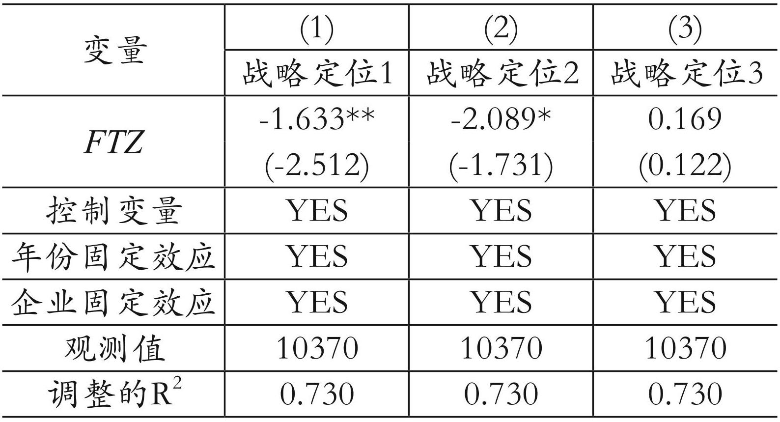 制度型开放立足于对接国际高水准制度安排,为企业的高质量发展提供良好的营商环境,但不同的自贸区根据地缘区位、经济安排、政策导向、人文诉求等因素具有不同的发展战略。湖北省自贸区以“实施中部崛起战略和推进长江经济带发展为战略导向”,更多的是服务于城市群建设;重庆市自贸区以“西部门户城市开发开放引领区,内陆开放战略支撑带先导区”为战略导向,侧重于服务内陆与沿海地区的协同发展。因此本文根据中商产业研究院对自贸区的战略定位,分为“深化改革和对外开放”(战略定位1)“服务城市群建设”(战略定位2)和“链接区域—区域或国内— 国际”(战略定位3),其中“深化改革和对外开放”以对接国际先进制度,深化本土改革,进而推广先进开放经验为导向。本文根据战略定位划分构建虚拟变量,并与核心解释变量交乘放入模型进行检验,结果如表4第(1)列所示,在排除了战略定位2和3的干扰后,自贸区系数依旧在5%水平上显著为负,说明本文以自贸区为载体讨论制度型开放对供应链的影响具有现实战略依据,提高了本文结论的稳健性。