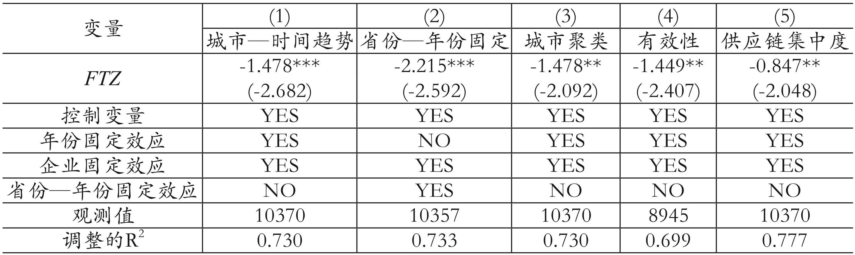 虽然不同的省市之间存在较大差别,但同一个城市内由于具有相同的政策作用、相似的人文基础和固有的禀赋资源等特征,其城市内部的经济变量往往具有相关性。因此本文通过聚类到城市层面的标准误来缓解其影响。表5第(3)列结果显示,在改为城市聚类标准误的情况下,自贸区系数仍然在5%水平上显著为负,与本文核心回归结论一致。