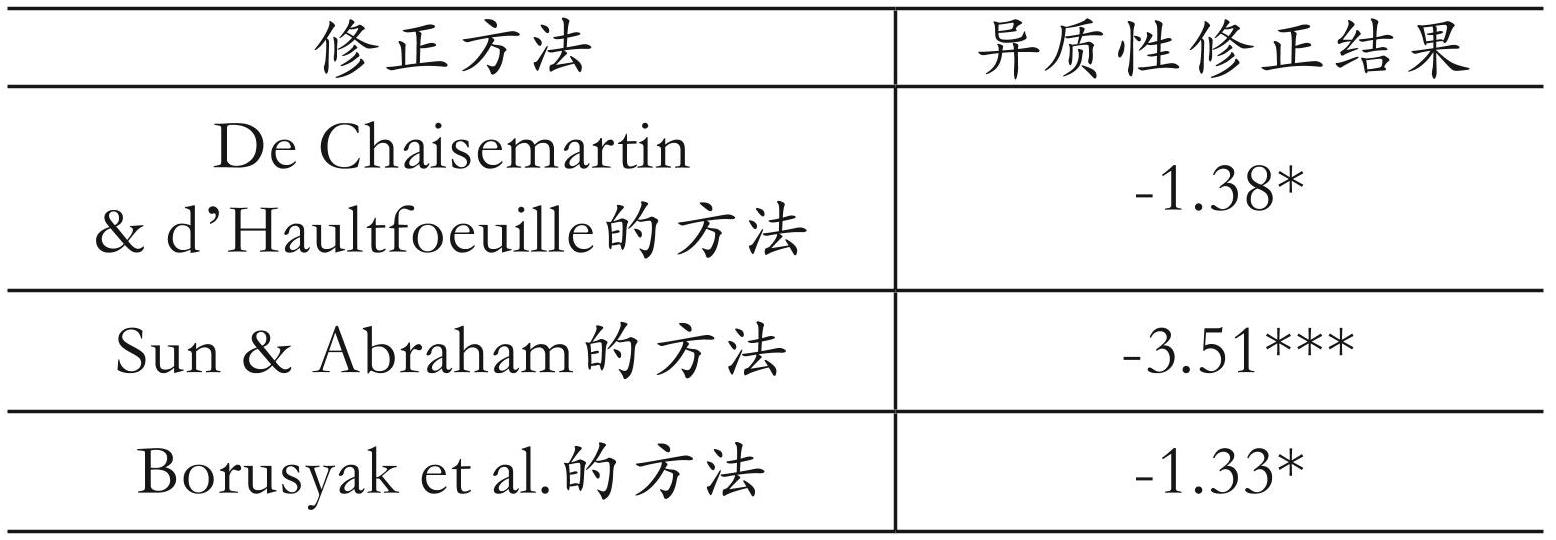 由于自贸区试点采取逐年批次推广,因此在使用多时点DID识别时就难以避免异质性处理效应对本文结论稳健性的干扰。因此,本文采用De Chaisemartin &d’Haultfoeuille(2020)提出的权重拆解方法来检验异质性处理效应。分析发现,在所有的2521个权重中,2104个权重为正,417个权重为负,负权重占比为16.54%,这意味着本文估计结果可能会受到“坏控制组”的影响。