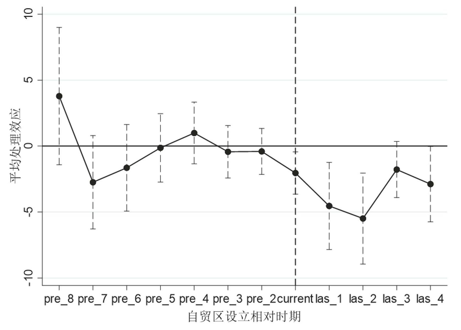 满足平行趋势检验是使用DID模型的重要前提,在自贸区政策实施前,处理组和控制组的供应商集中度具有相似的发展趋势,不存在系统性差异。本文采取双重差分模型,对应构建如下动态模型为供应商集中度的时变特征提供一定支撑。