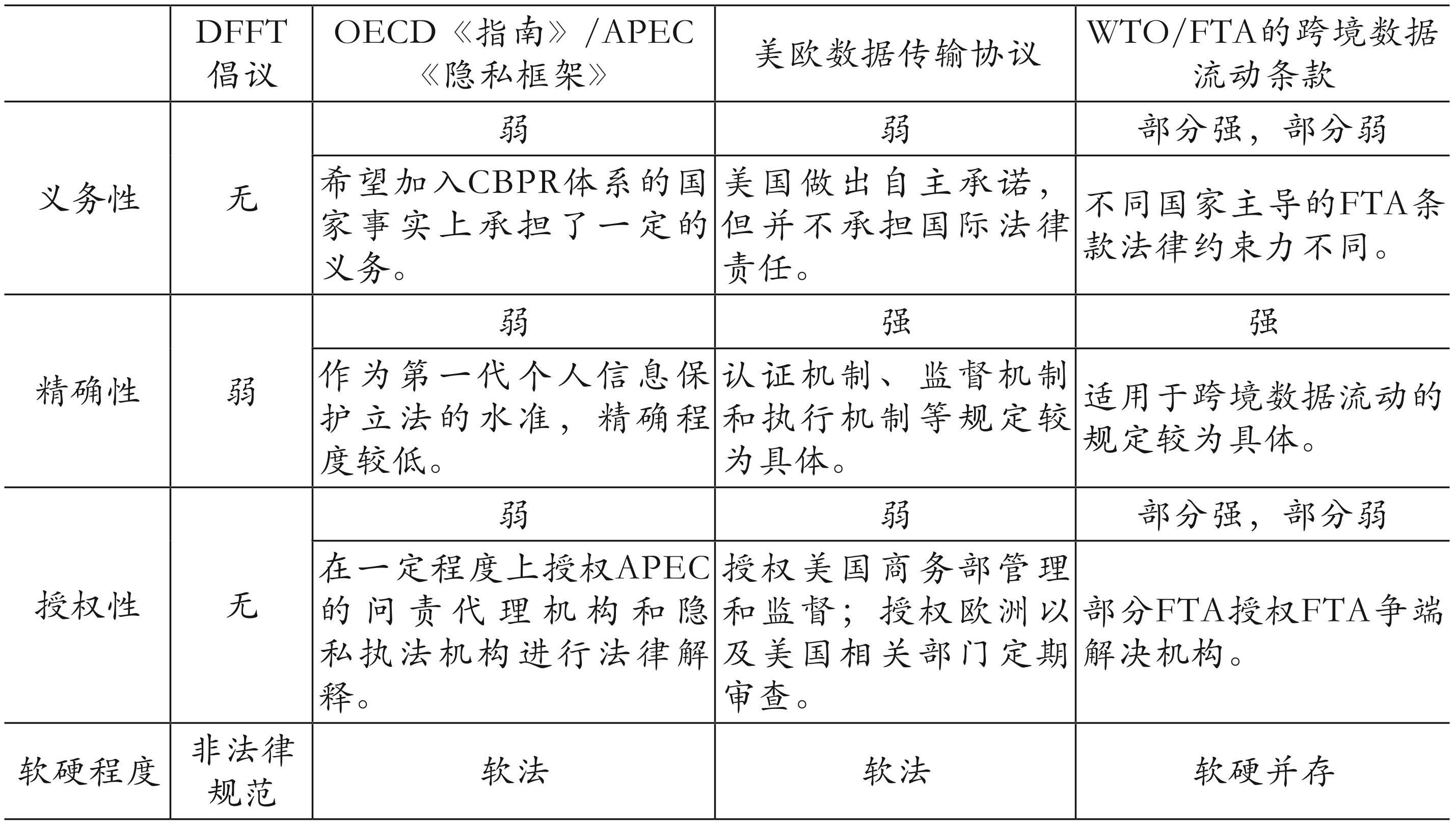 参考精确性、义务性、授权性的法治三要素,现有的跨境数据流动国际造法可分为非法律规范、国际组织下的软法、政府间的软法和软硬并存的经贸条款四类(详见表1)。在这些实践样态中,非法律规范以倡议性文件为代表,尚无义务性和授权性;国际组织下的软法以经济合作与发展组织(OECD)和亚太经合组织(APEC) 出台的文件为代表,义务性、精确性、授权性较弱;政府间的软法以美欧之间的数据传输协议为代表,虽然内容规定已经较为具体,但是义务性和授权性仍相对较弱;经贸协定中的跨境数据流动条款则具备软硬并存的特征,部分区域贸易协定(FTA)中的跨境数据流动条款已初步具备义务性和授权性。