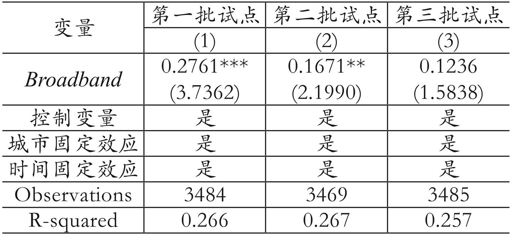“宽带中国”试点城市于2014、2015、2016年分三批遴选,第一批试点城市大多位于东南沿海经济发达地区,第二批和第三批试点城市则主要集中于经济实力相对偏弱的中西部地区。那么,不同批次试点政策的外资吸引效应是否存在异质性?为此,本文依次检验了不同批次“宽带中国”试点政策对城市外资吸引力的影响。具体地,从样本中剔除2015年和2016年的试点城市,仅保留2014年的试点城市作为实验组,将渐进DID模型转化为传统DID模型重新进行因果识别,结果如表9第(1)列所示,Broadband的估计系数在1%水平上显著为正,且系数值高于基准回归结果。表9第 (2)列汇报了仅考虑2015年试点城市的估计结果,可以观察到核心解释变量估计系数的数值大小和显著性水平相较于基准回归出现了下降,但符号方向并未发生实质性变化。表9第(3)列汇报了仅考虑2016年试点城市的估计结果,同样显示政策虚拟变量的估计系数为正,但是估计系数的数值大小和显著性水平均出现了较大程度的下降。综合表9的回归结果可以推断,不同批次 “宽带中国”试点政策的外资吸引效应存在显著差异,第一批次试点政策对城市外资吸引力的影响最为明显,第二批次和第三批次试点政策对城市外资吸引力的影响依次减弱。