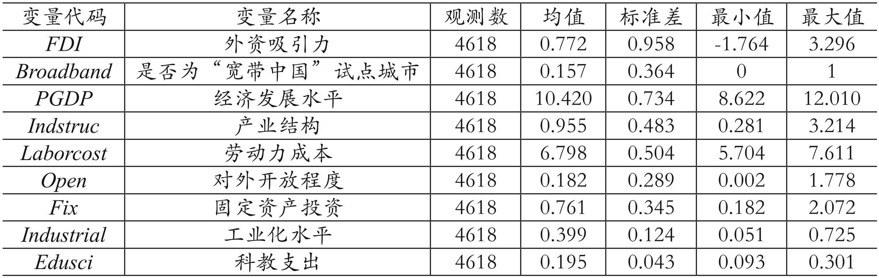 本文所用的“宽带中国”政策试点城市名单数据来源于工信部官网,用于构造外资吸引力指标的外资企业进入和退出相关信息来源于CnOpenData数据库,城市层面控制变量主要来源于《中国城市统计年鉴》。本文对合并后的样本数据作如下处理:一是删除关键变量存在严重缺失的样本;二是采用插值法对部分缺失数据进行填补。