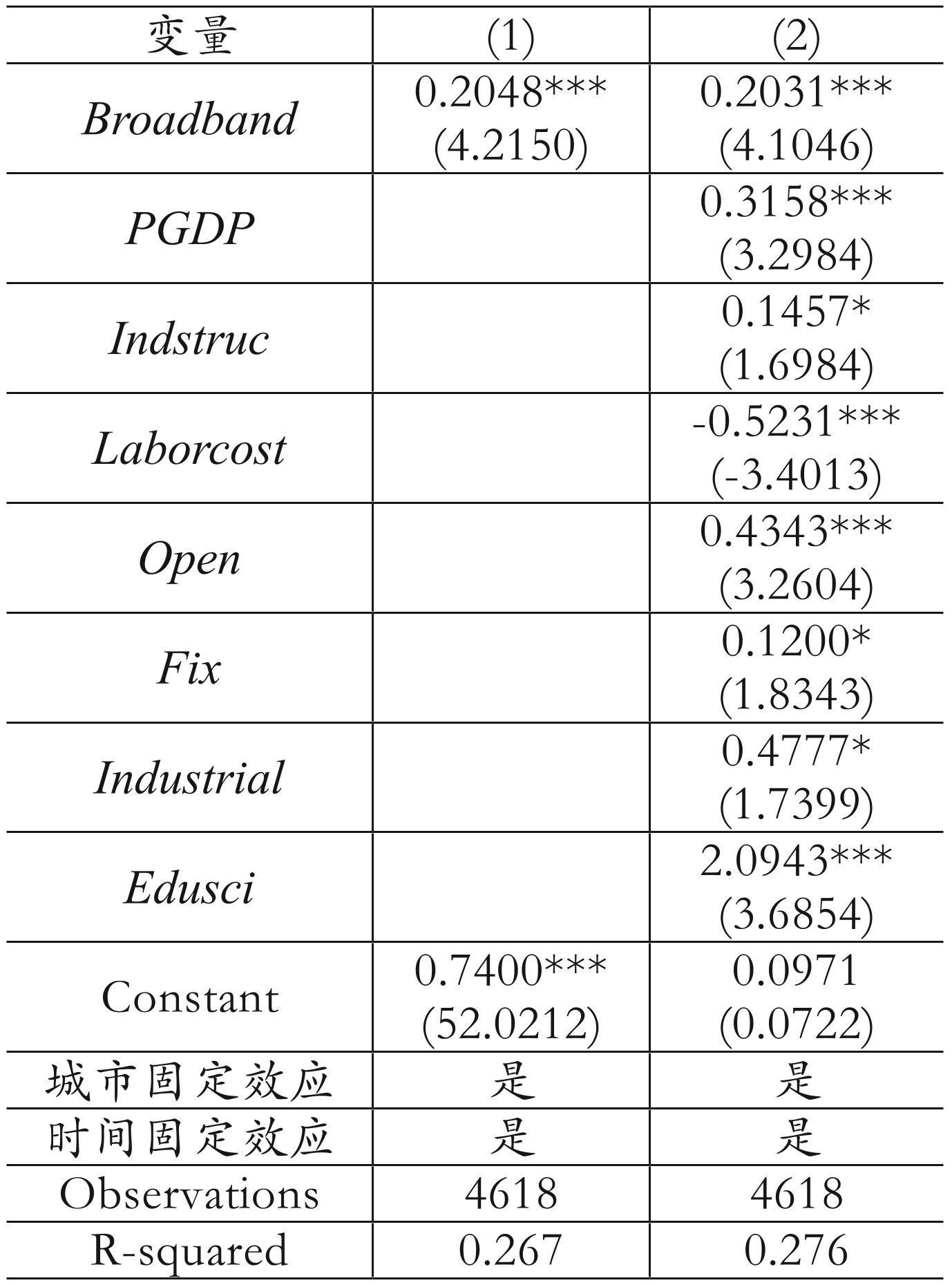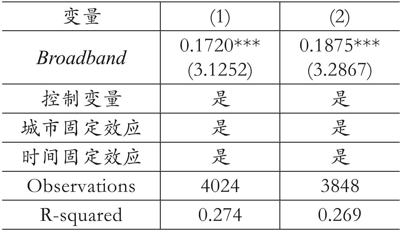 本文在方福前等(2023)和Hong et al.(2023)的研究基础上,根据各城市在不同时间入选“宽带中国”试点设置政策虚拟变量Broadbandit,以此代表数字基础设施建设的推进程度。对于入选“宽带中国”政策试点的城市,Broadbandit在当年及样本观测期内的后续年份均取值为1,否则为0;对于未入选“宽带中国”政策试点的城市,Broadbandit在样本观测期内均赋值为0。