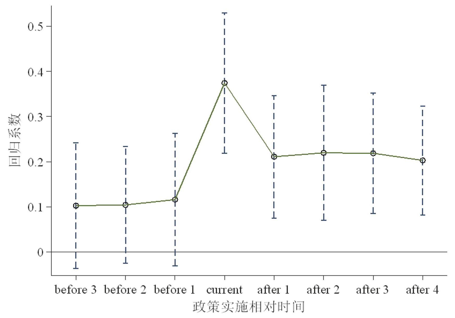 DID方法能够有效识别因果关系的一个重要前提是满足平行趋势假设。为验证上述研究结论是否符合DID模型的平行趋势假设,本文借鉴事件分析法的思路,构建如下动态模型: