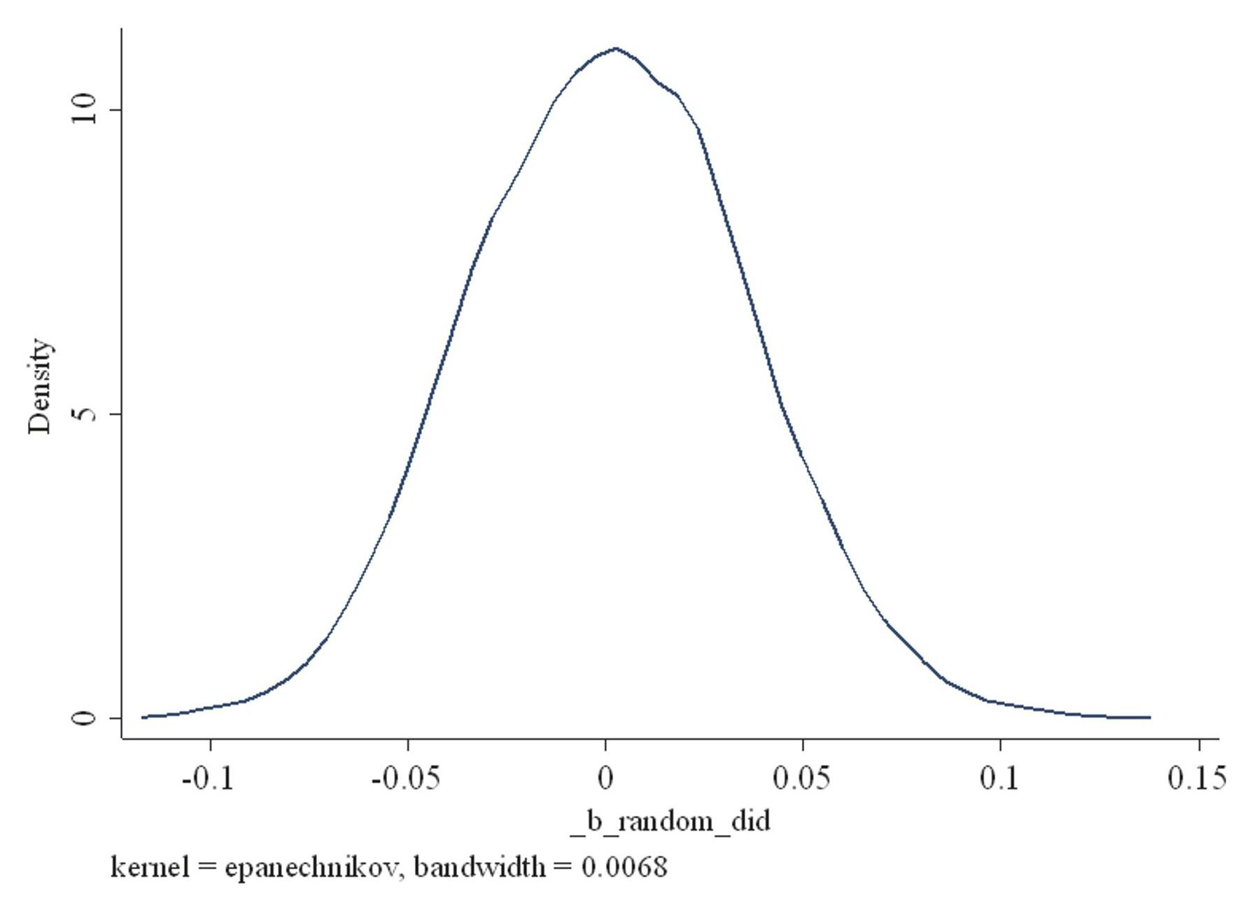 本文借助安慰剂检验以反事实方式确认“宽带中国”试点政策提高城市外资吸引力的稳健性。具体而言,首先在观测样本中随机分配试点城市和非试点城市,进而构造虚假实验组和对照组,然后根据政策试点时间生成虚假的政策虚拟变量Broadband,按照式(1) 进行2000次的模拟回归,观察估计系数均值是否接近于0。