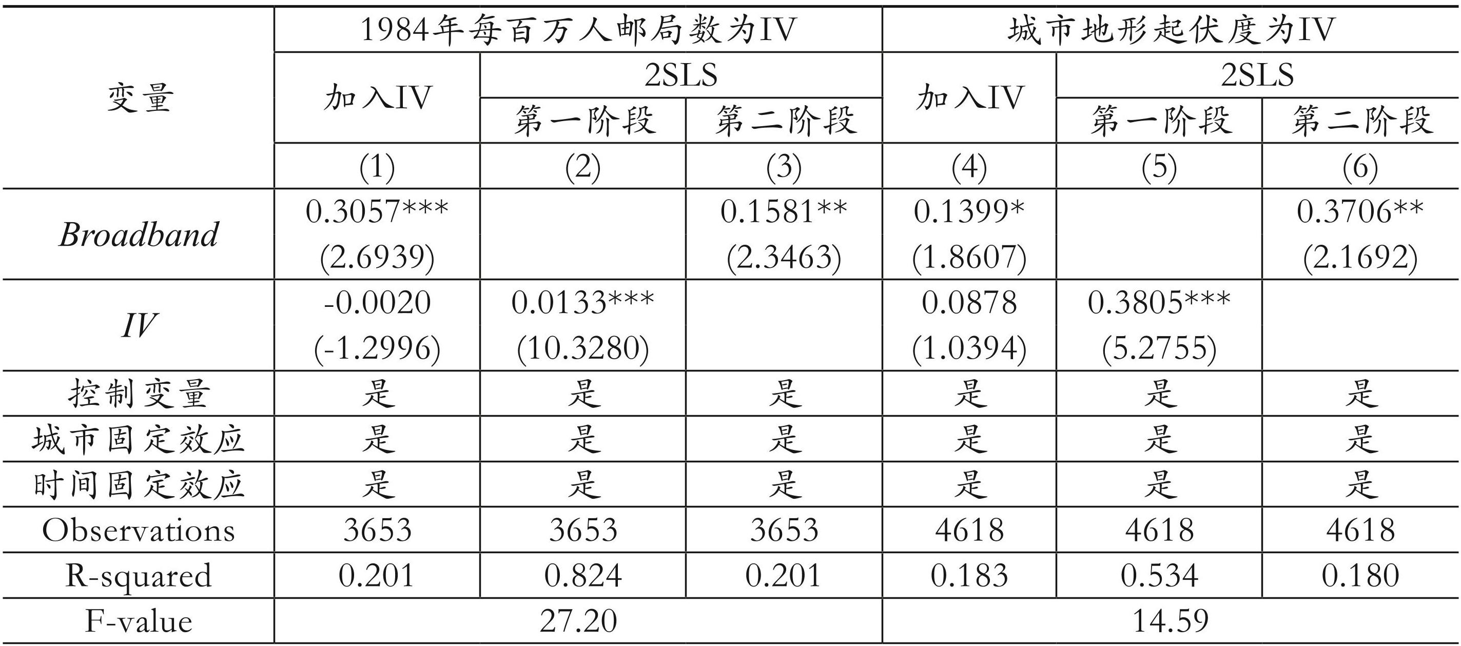 为进一步讨论内生性问题,本文首先参照黄群慧等(2019)的研究,采用1984年各城市每百万人邮局数量作为“宽带中国”试点政策选址的工具变量,估计结果如表6第(1)至(3)列所示。从中可以观察到,列(1)中工具变量的估计系数未通过显著性检验,表明工具变量具有一定的外生性。列(2)和列(3)报告了采用两阶段最小二乘法(2SLS)实现工具变量估计的检验结果。其中,第(3)列中工具变量估计的第二阶段结果显示,Broadband变量的系数显著为正,表明“宽带中国”试点政策对城市外资吸引力仍然存在显著的提升作用。第(2)列为工具变量估计的第一阶段结果,显示工具变量的系数在1%水平上显著为正,这表明工具变量与核心解释变量之间存在显著的正相关关系,即工具变量满足相关性要求。同时,用于检验弱工具变量的相应F统计量的值为27.20,远大于弱工具变量的临界值10,意味着不存在弱工具变量问题。此外,以刘传明和马青山(2020)为代表的部分研究基于地理视角构造了数字基础设施建设的工具变量,本文也借鉴其做法将地形起伏度作为“宽带中国”试点政策选址的工具变量,估计结果如表6第(4)至(6)列所示。结果同样显示,以“宽带中国”试点政策为代表的数字基础设施建设对城市外资吸引力产生了显著的积极效应。