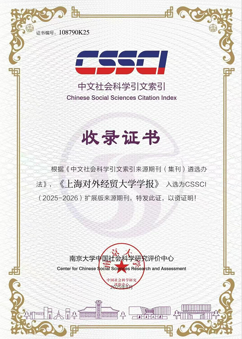 根据《中文社会科学引文索引来源期刊(集刊)遴选办法》,《上海对外经贸大学学报》入选为CSSCI(2025-2026)扩展版来源期刊(证书编号:108790K25)。目前,学报已四次入选CSSCI扩展版,分别是2017-2018,2019-2020,2023-2024,2025-2026。
